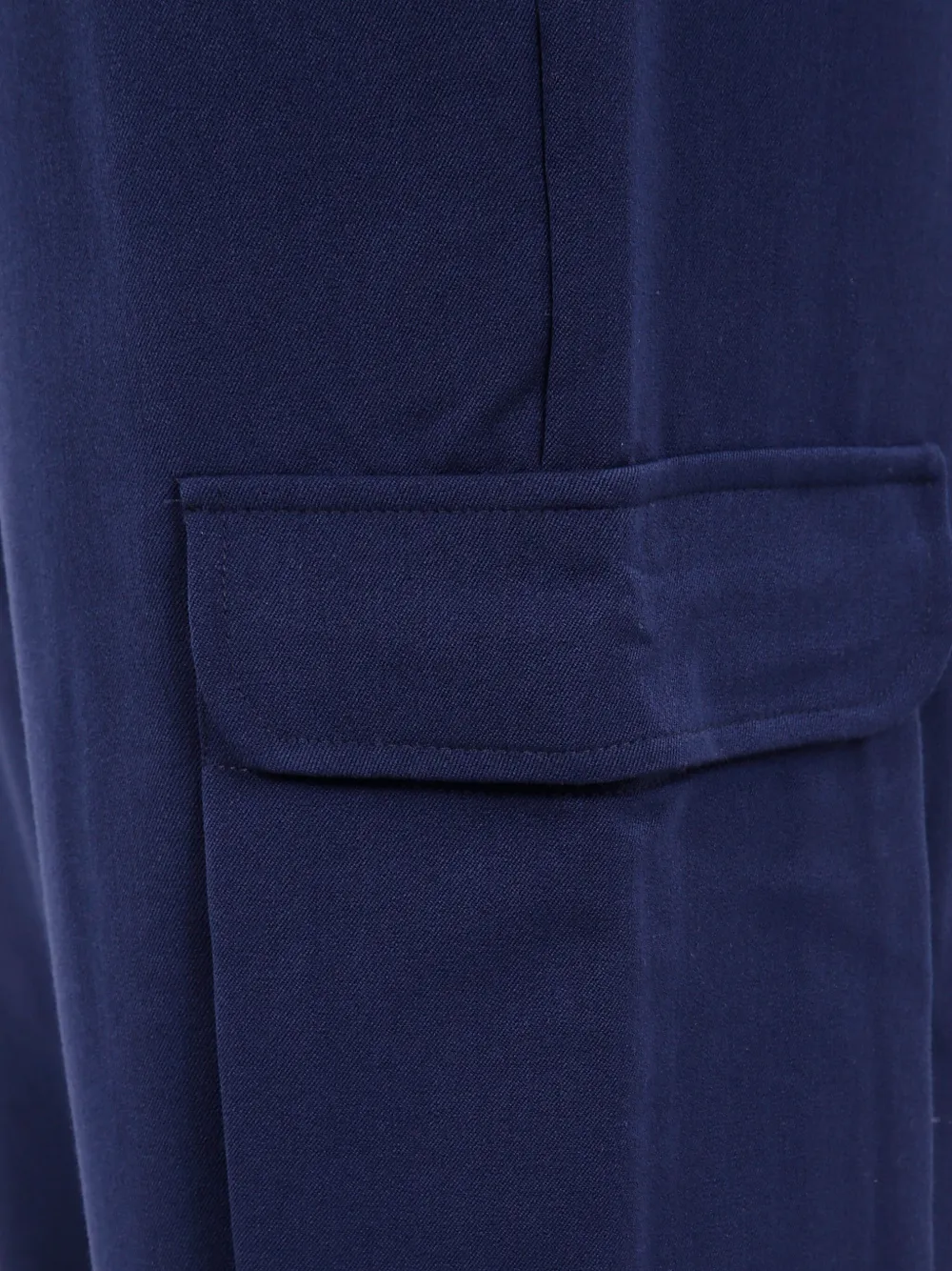 Темно-синий цвет, боковой карман карго, задние накладные карманы с клапанами, шлевки для ремня, застежка на пуговицу, декоративное кольцо
