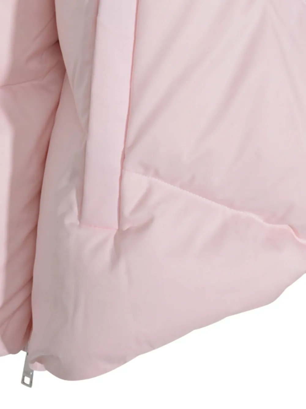 Розовый пухлый дизайн с простежкой «елочка», застежка на молнию, несъемный капюшон, боковые прорезные карманы, длинные рукава, прямой подол
