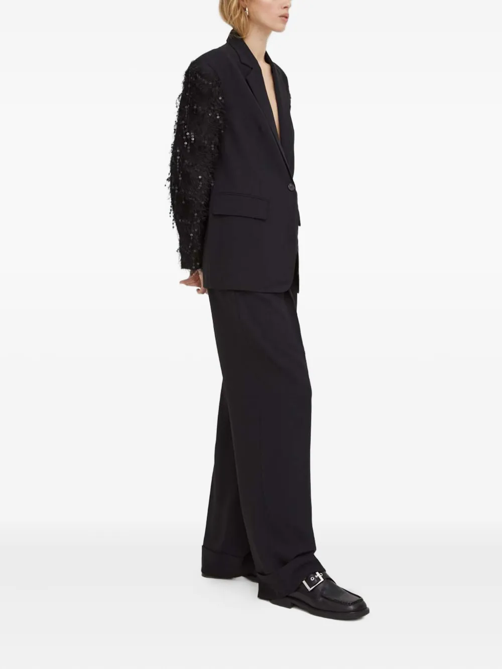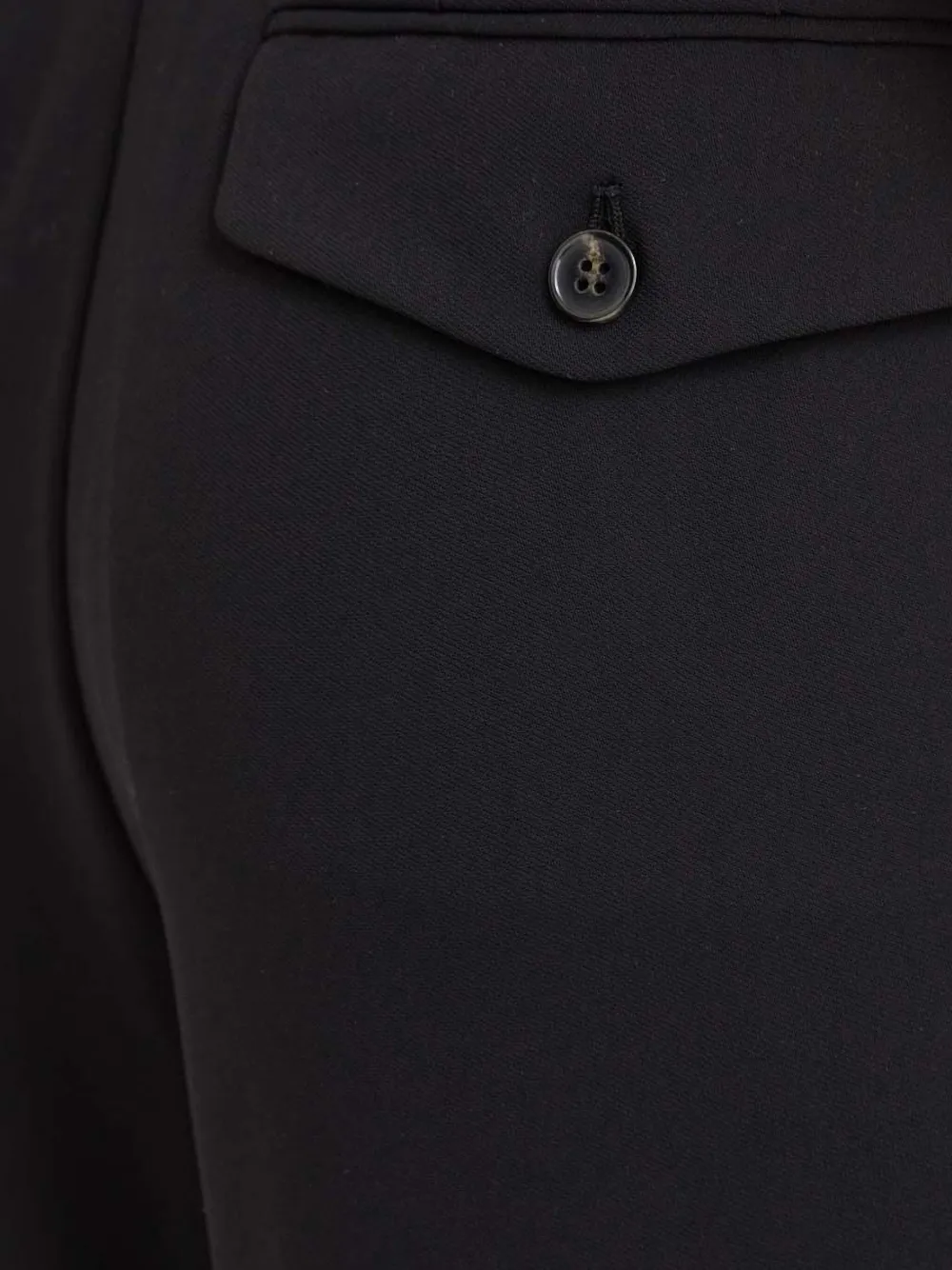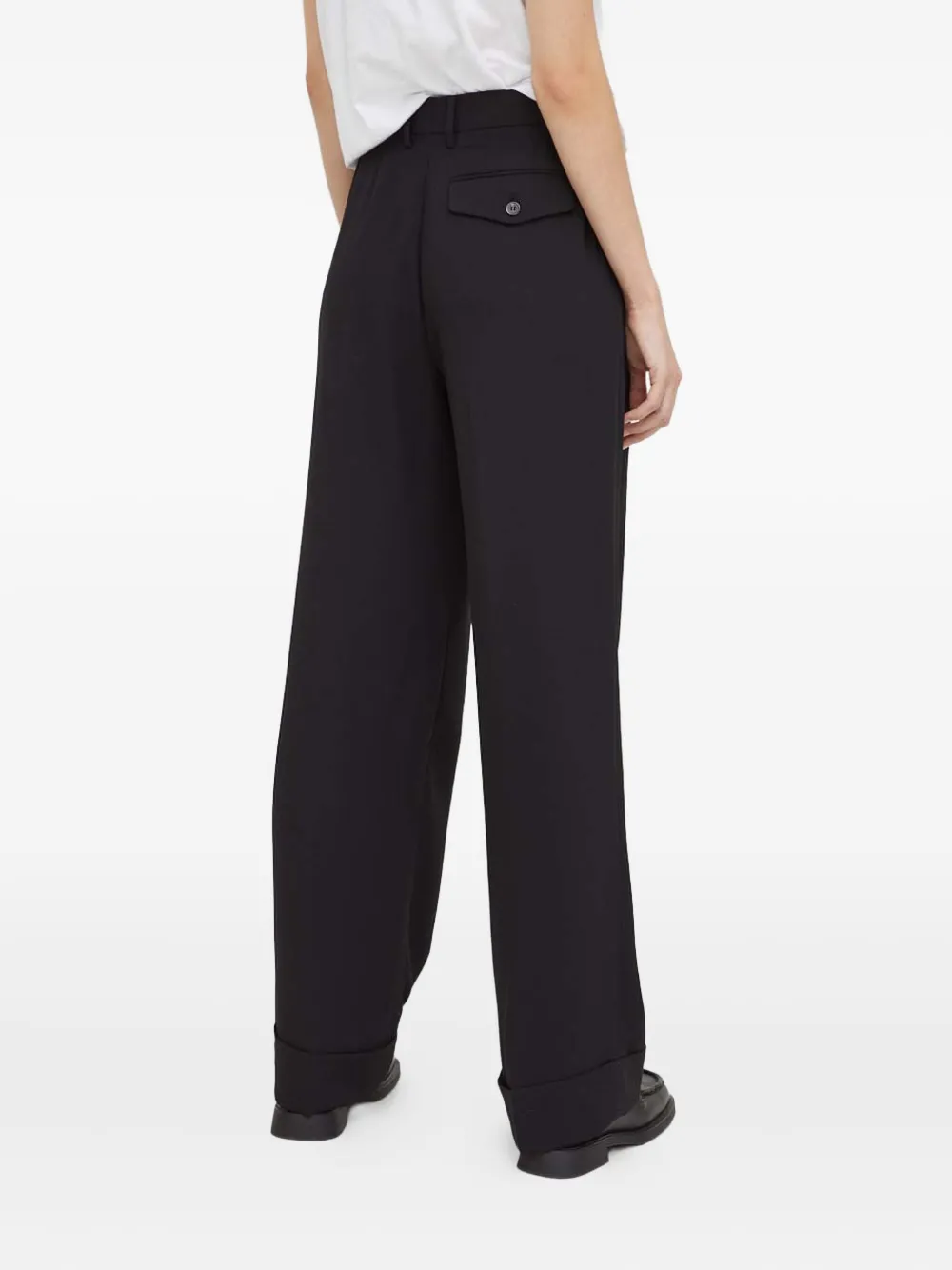 Черные брюки с застегивающимися клапанами на карманах, шлевками для пояса, складками спереди, подворотами на нижнем крае и скрытой застежкой