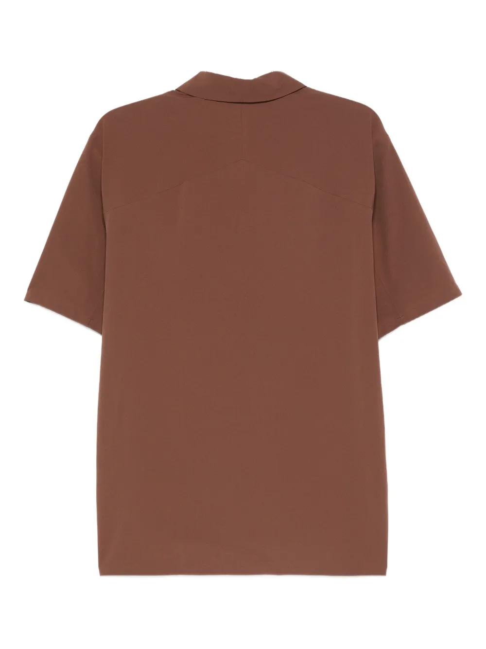 Коричневая рубашка с отложным воротником, короткими рукавами, двумя нагрудными карманами с клапанами, потайной застежкой на пуговицы и прямым подолом