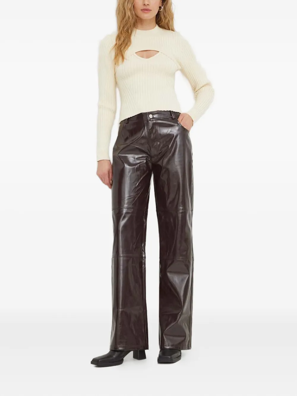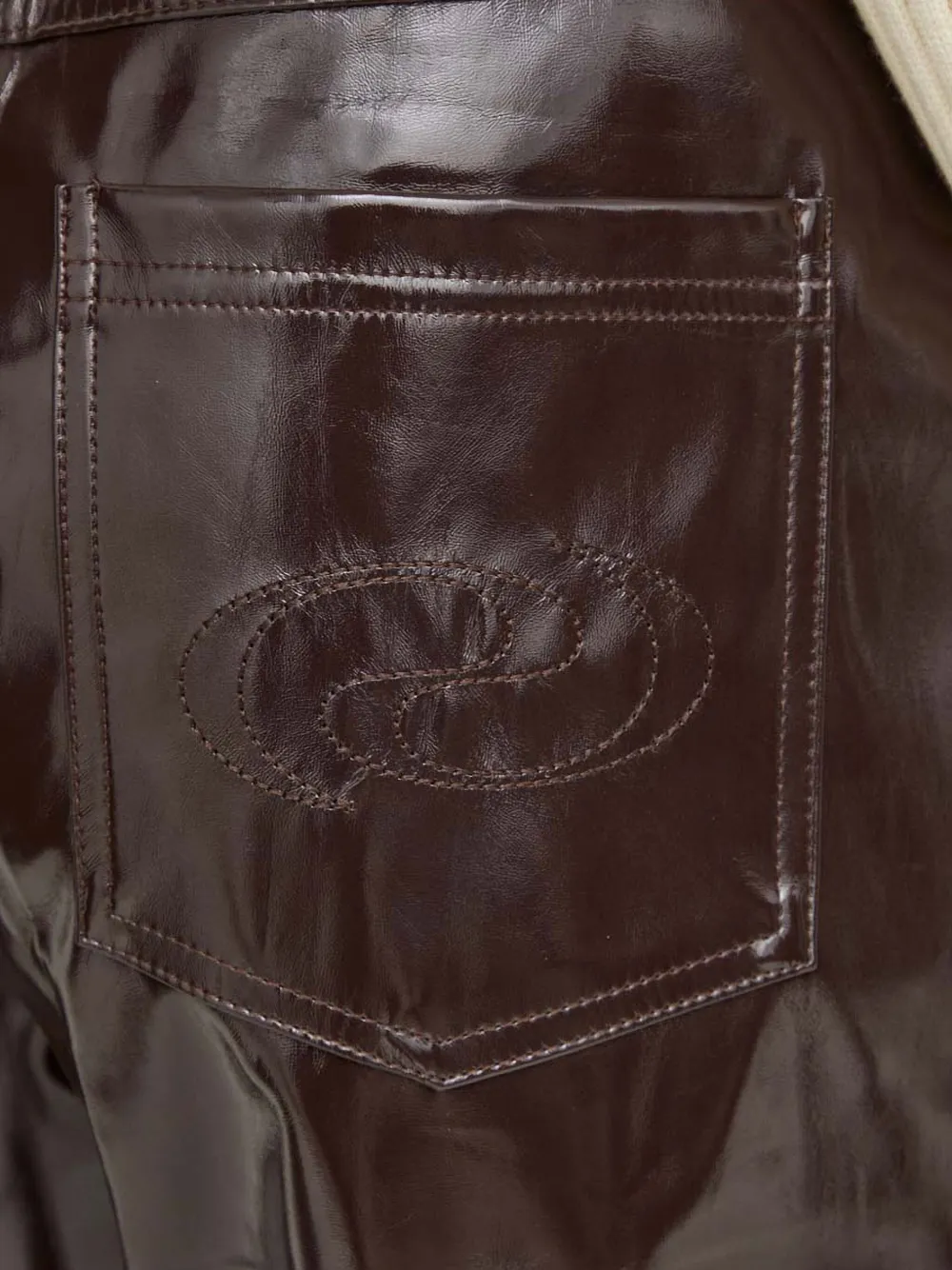 Коричневый цвет, панельный дизайн, логотип, задние карманы, шлевки для ремня, глянцевая отделка