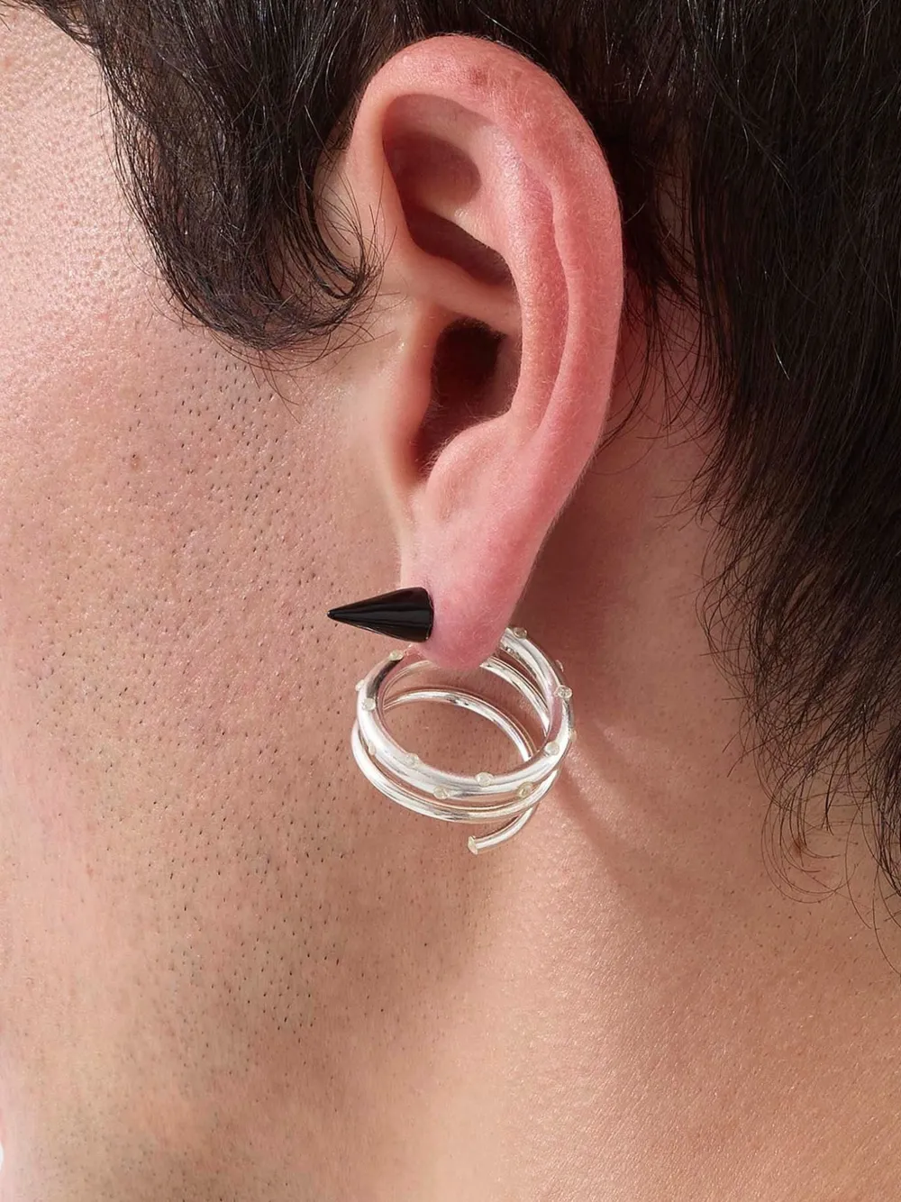 Серьга серебристого цвета с спиральным дизайном и конусовидной деталью для проколотых ушей. Это одиночная серьга.