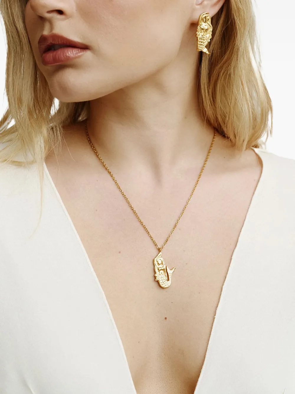 Золотистый оттенок, дизайн в виде русалки, застежка-гвоздик. Обычное ежедневное использование и внешние факторы могут уменьшить блеск драгоценных камней и золотых поверхностей. Для ухода используйте специальные неабразивные средства, предназначенные для очистки ювелирных изделий.