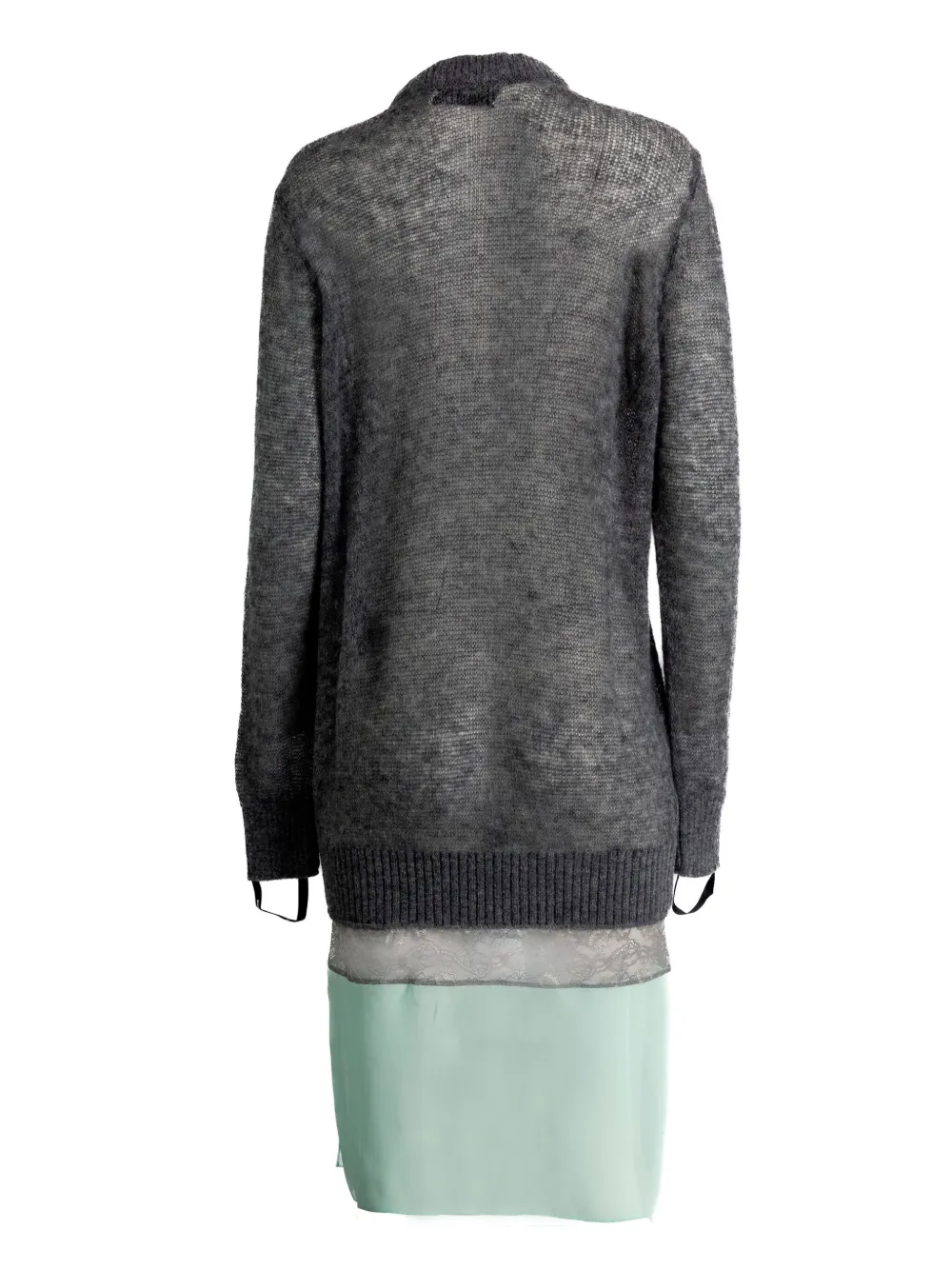 Серый топ с ребристой отделкой, длинными рукавами, круглым вырезом и кружевной отделкой