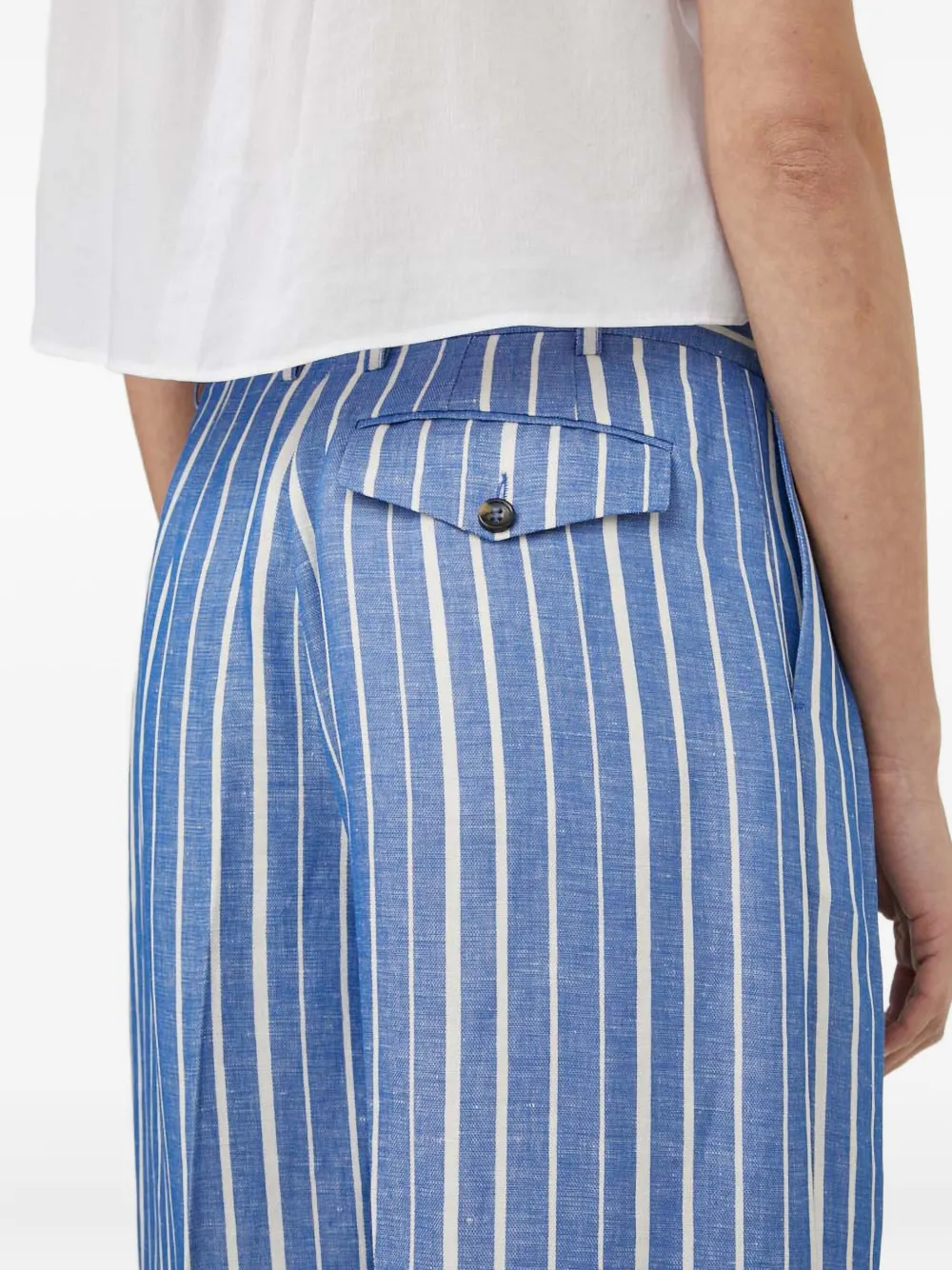 Синий и белый полосатый узор, застежка на пуговицы, накладные карманы с клапанами, шлевки для ремня, защипы спереди, скрытая застежка