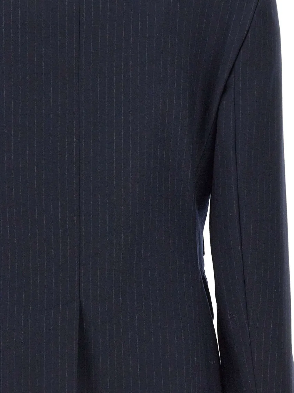 Синий костюм в тонкую полоску с лацканами с вырезом, застежкой на три пуговицы, манжетами на пуговицах и прорезными карманами с клапанами