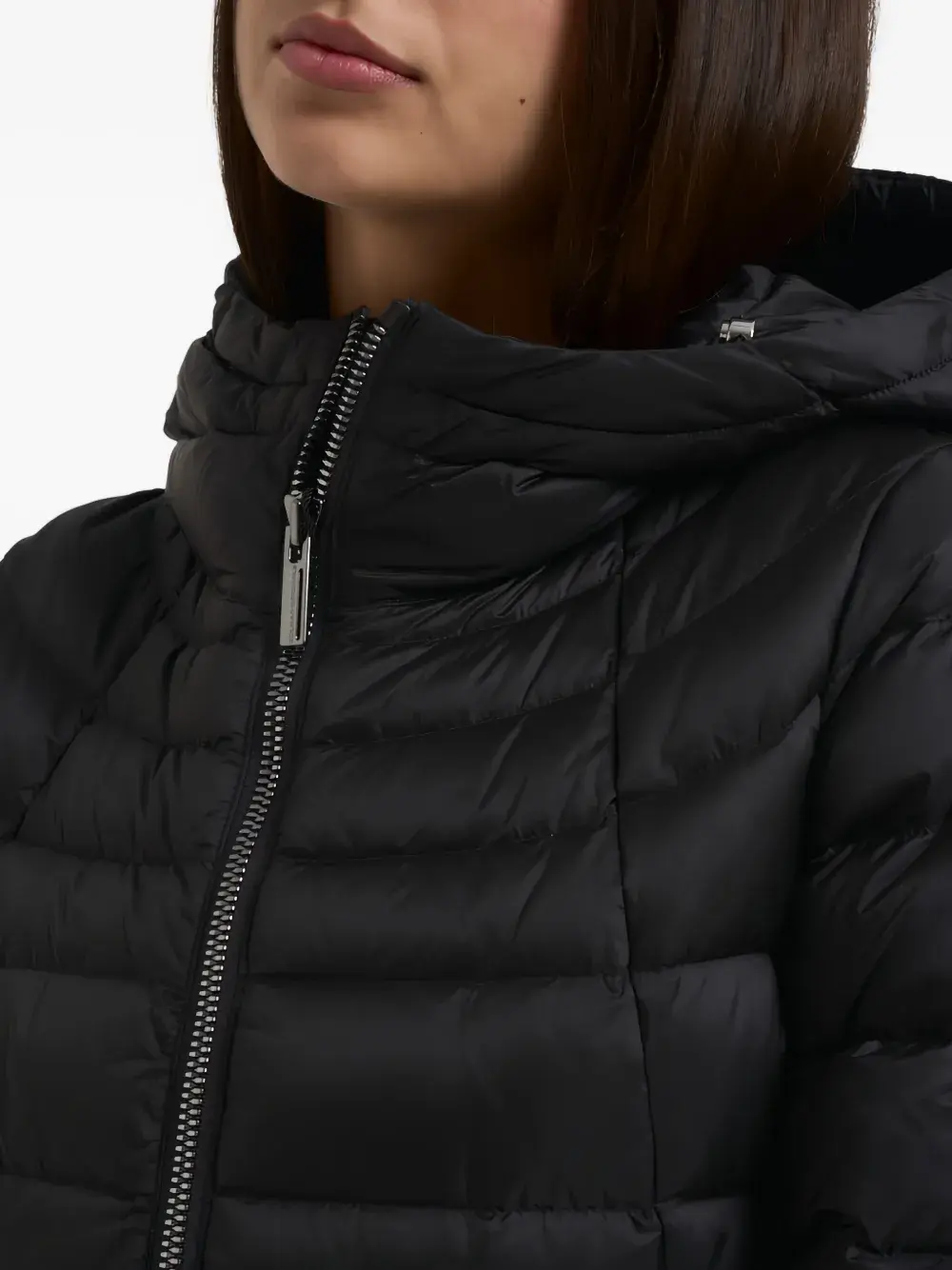 Черный стеганый капюшон с регулируемым шнурком, двухсторонняя застежка-молния, нашивка с логотипом, боковые карманы на молнии, логотип на левом рукаве