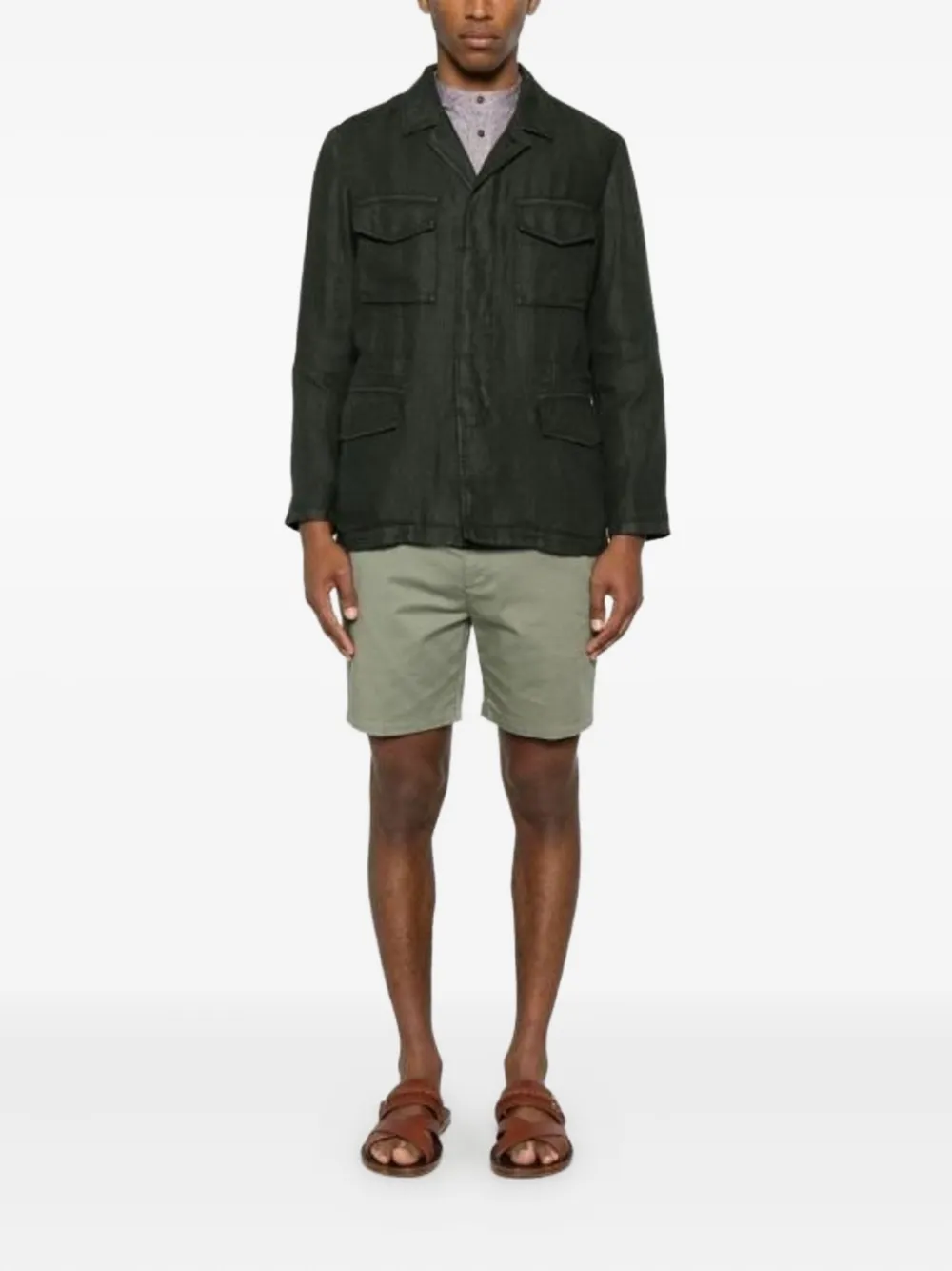 Зеленая рубашка с четырьмя карманами, отложным воротником, длинными рукавами и застежкой на пуговицы
