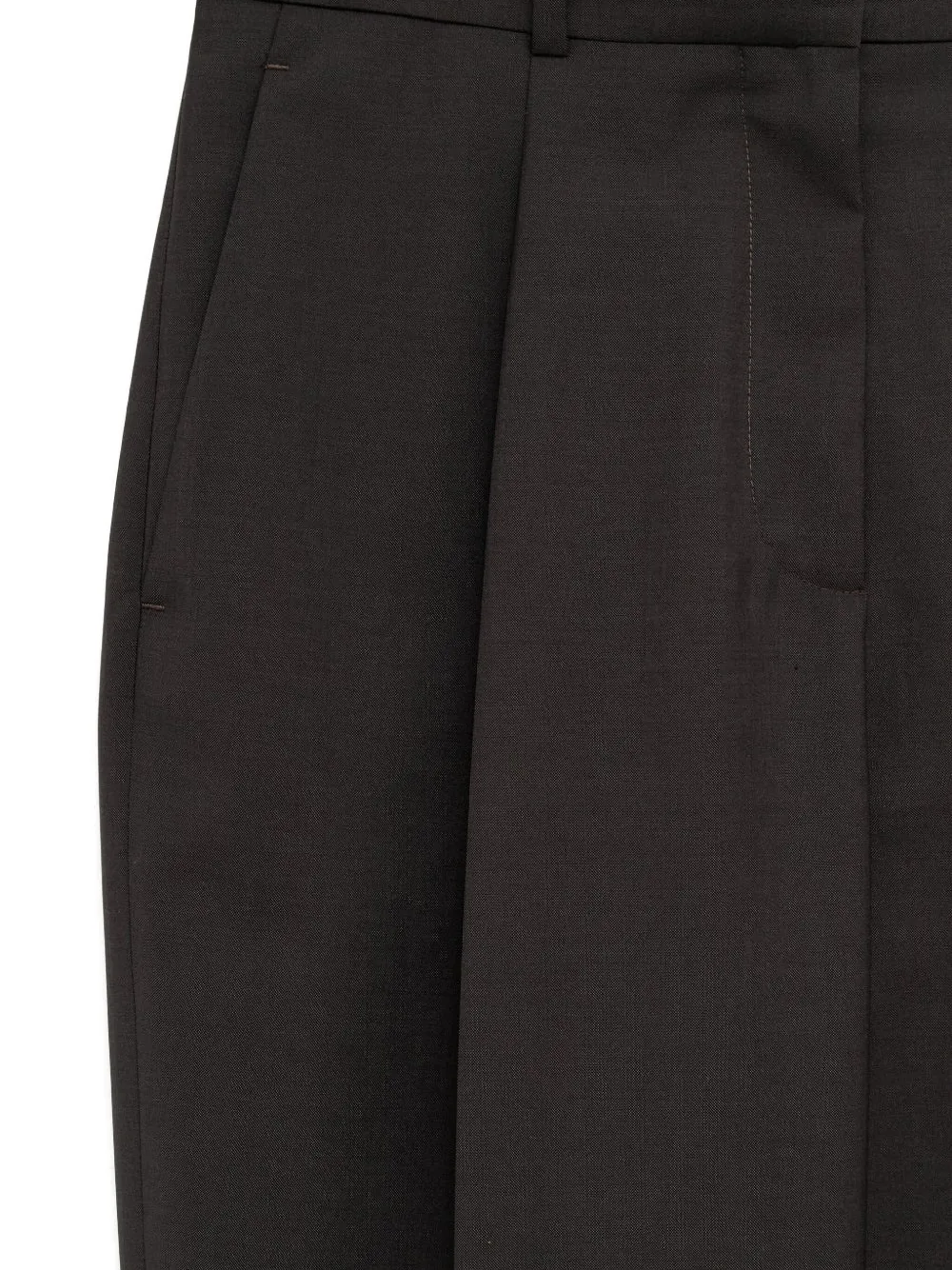 Темно-коричневый, складки, шлевки для ремня, боковые карманы в шве, задние прорезные карманы, скрытая застежка