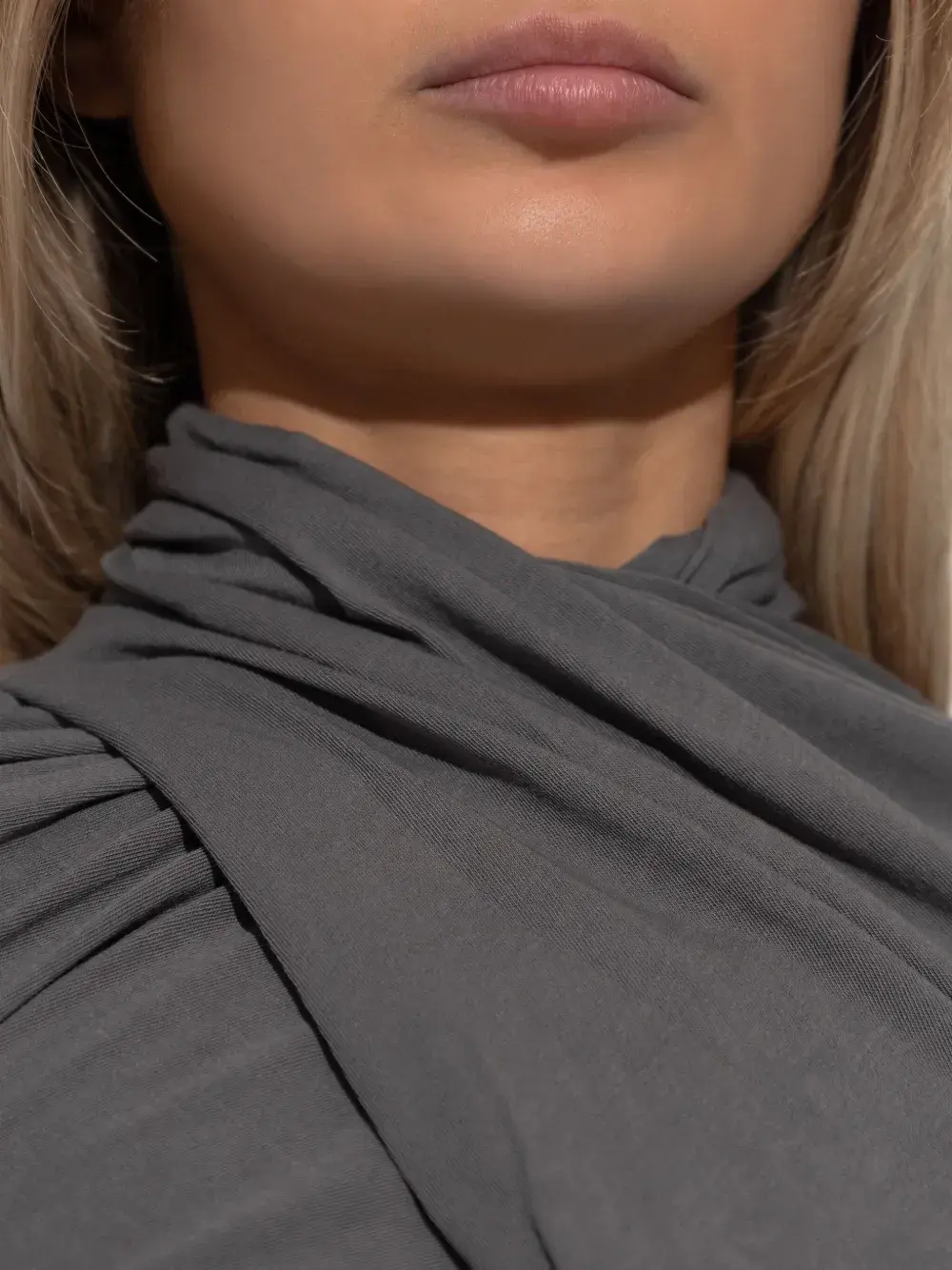 Темно-серый цвет, длинные рукава, высокий воротник, сборки, драпировка