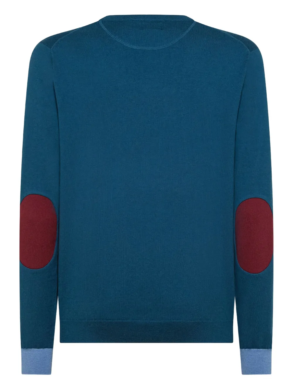 Синие нашивки на локтях, круглый вырез, длинные рукава, манжеты и низ в рубчик