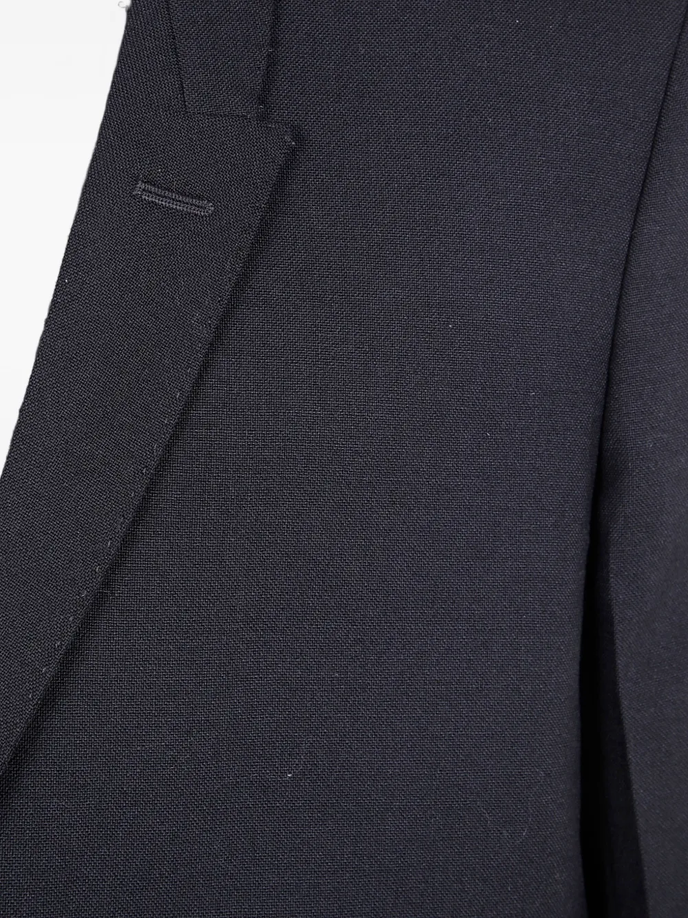 Черная шерсть, застежка на одну пуговицу, лацканы с вырезом, ремешок сзади, передние прорезные карманы