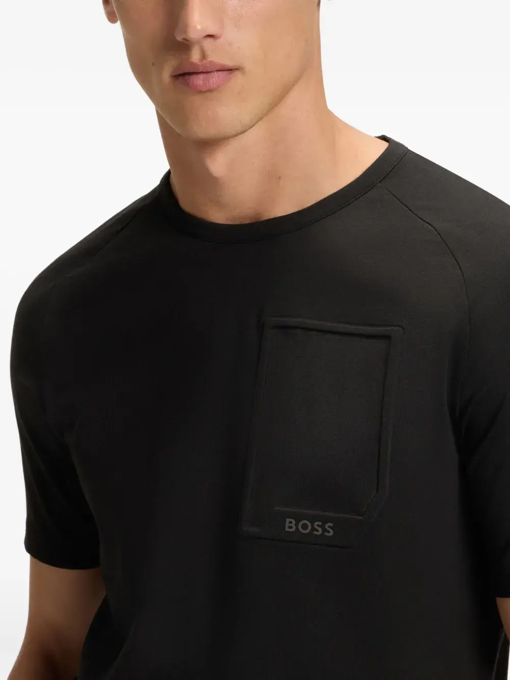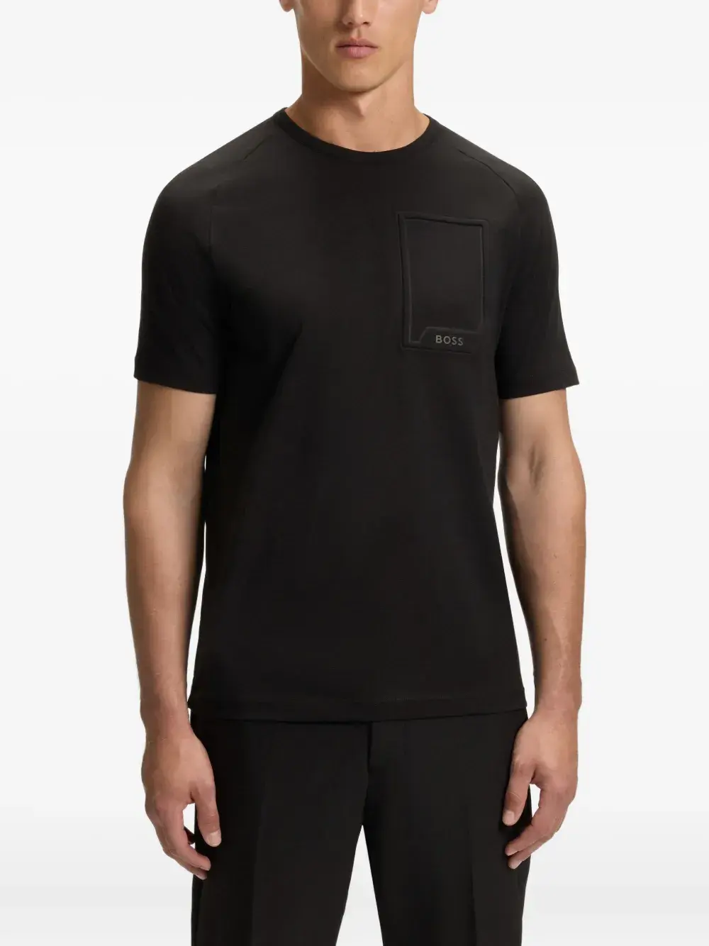 Черная футболка с круглым вырезом, короткими рукавами, нагрудным карманом, тоном логотипа и прямым низом