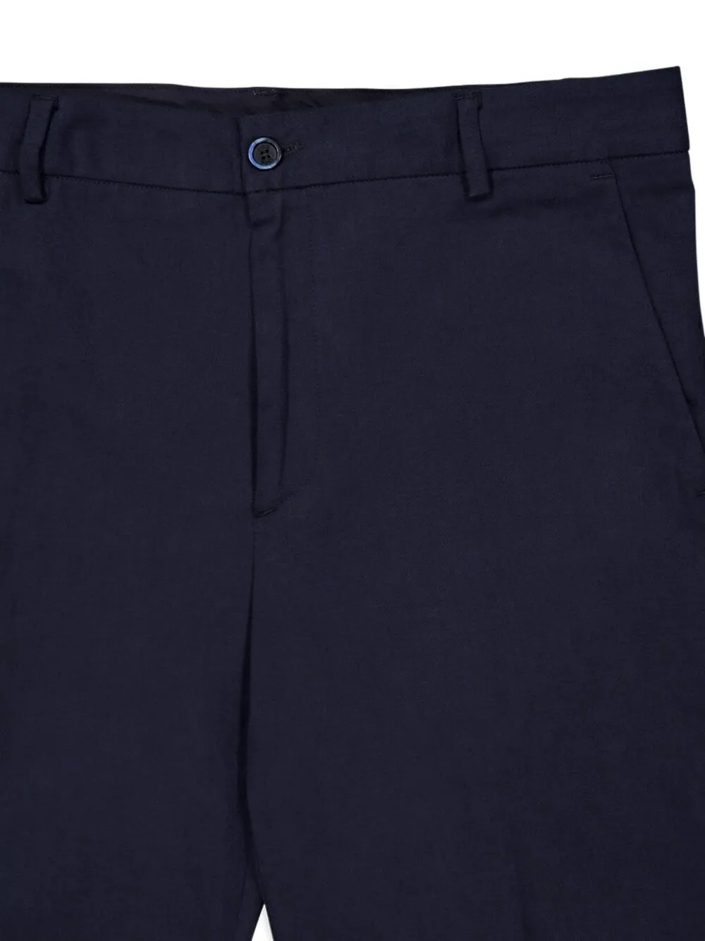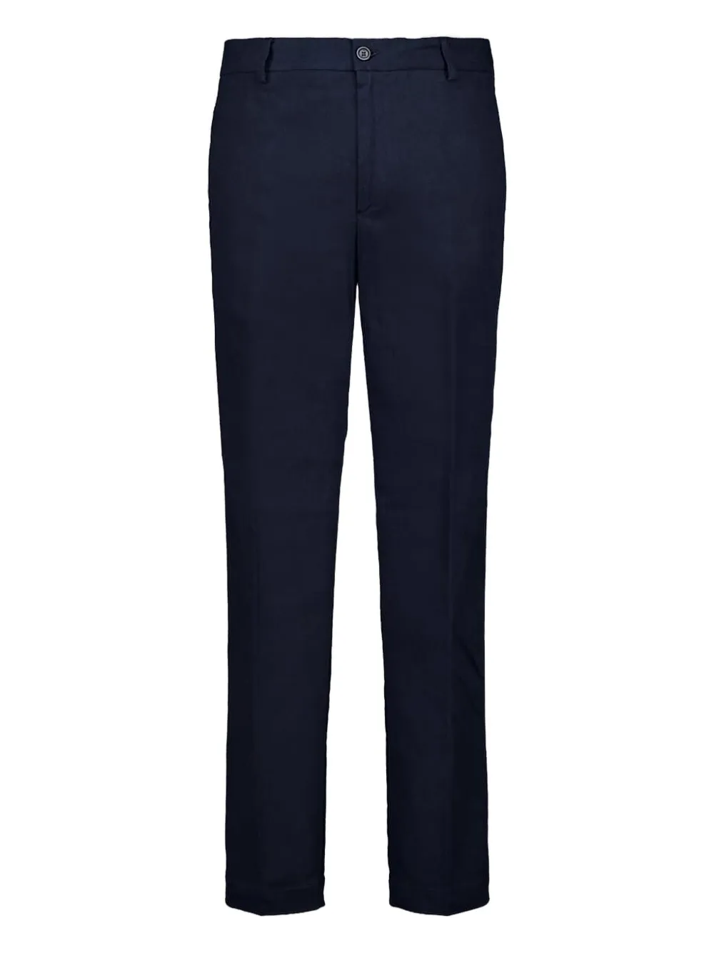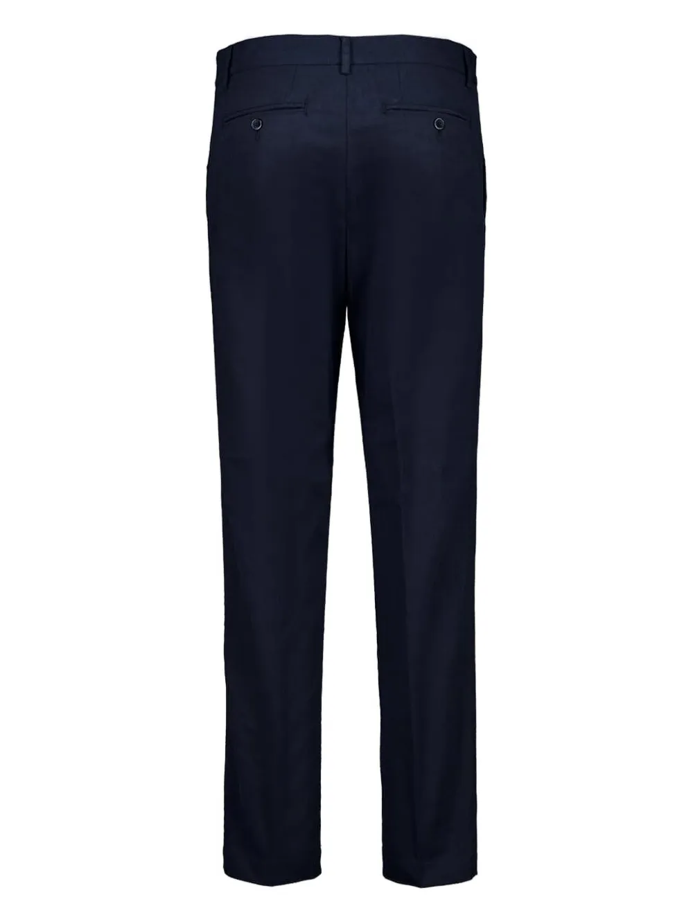 Полуночного-синего цвета, прямые штанины, застежка на пуговицу, шлевки для ремня, задний прорезной карман