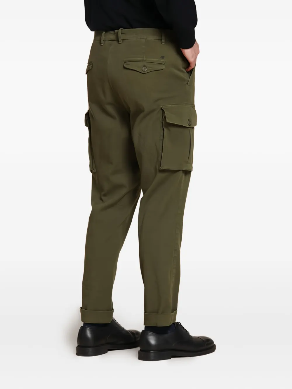 Военно-зеленый цвет, гульфик на пуговицах, шлевки для ремня, карманы с клапанами на пуговицах, отделка складками