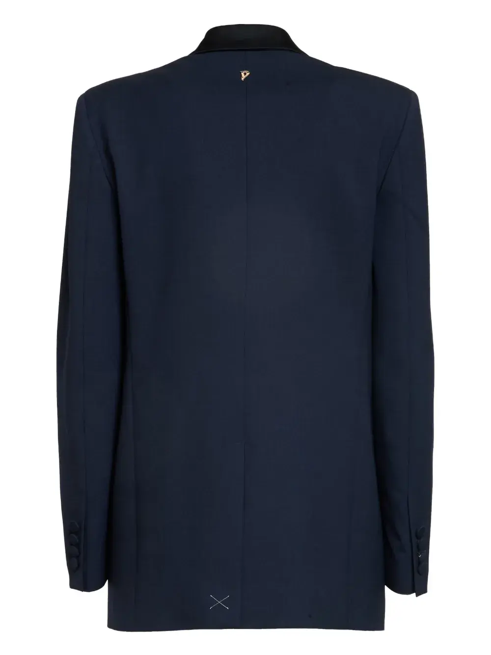Темно-синий двубортный пиджак с острыми лацканами, застежкой на пуговицы, длинными рукавами, прорезными карманами