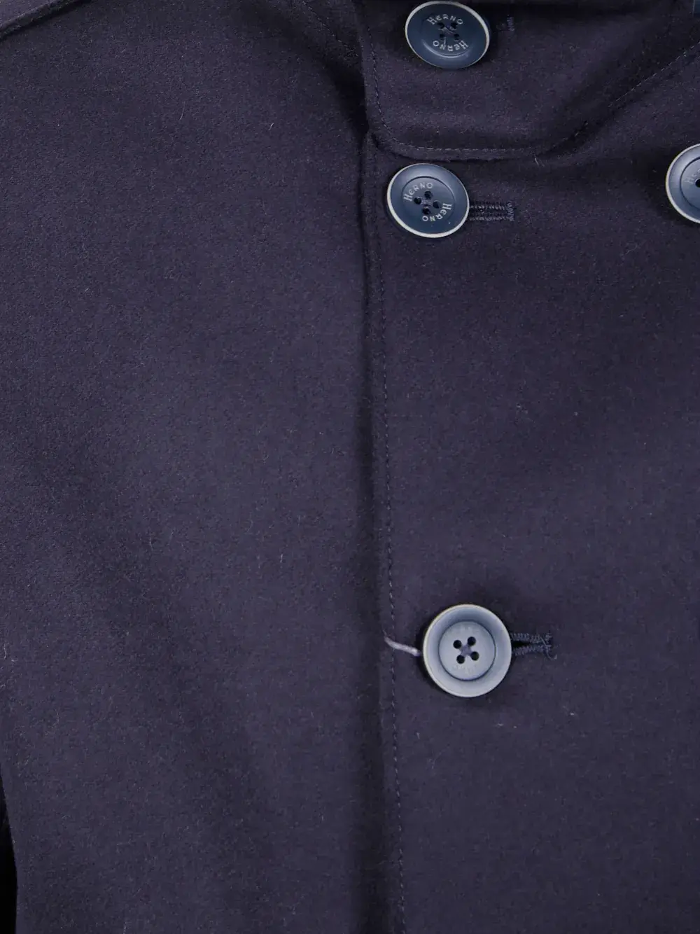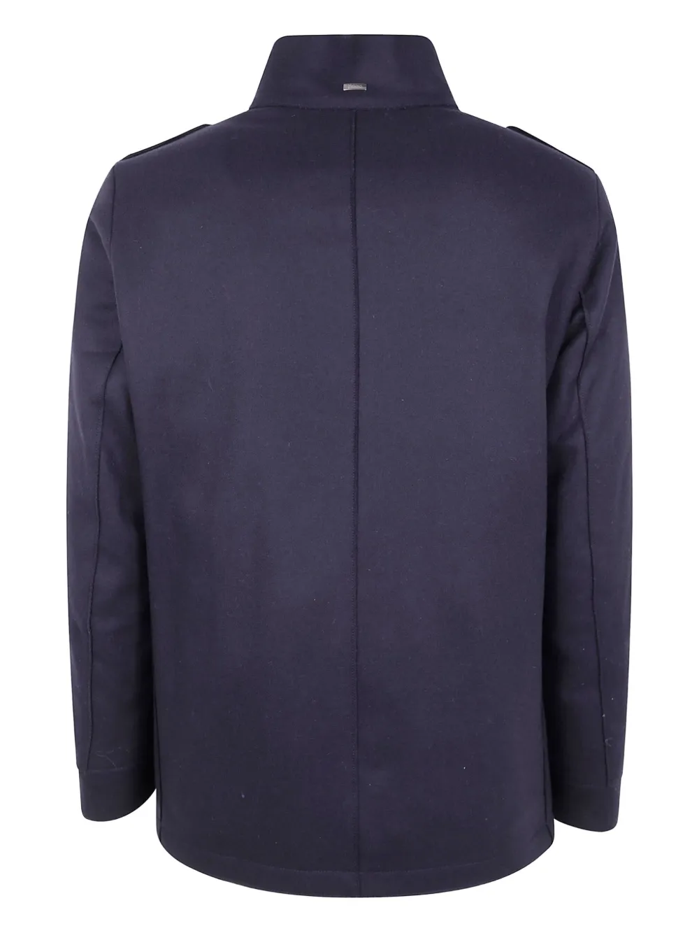 Темно-синий двубортный пиджак с застежкой на пуговицы, высоким воротником, наплечными погонами и прорезными карманами