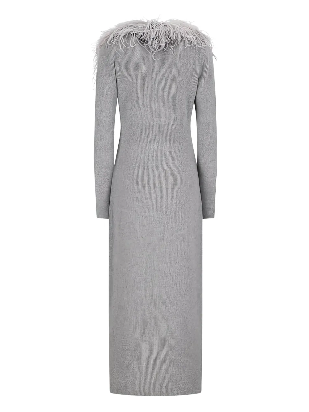 Серый удлиненный кардиган с длинными рукавами, открытой передней частью и отделкой из перьев, выполненный в рубчатой вязке