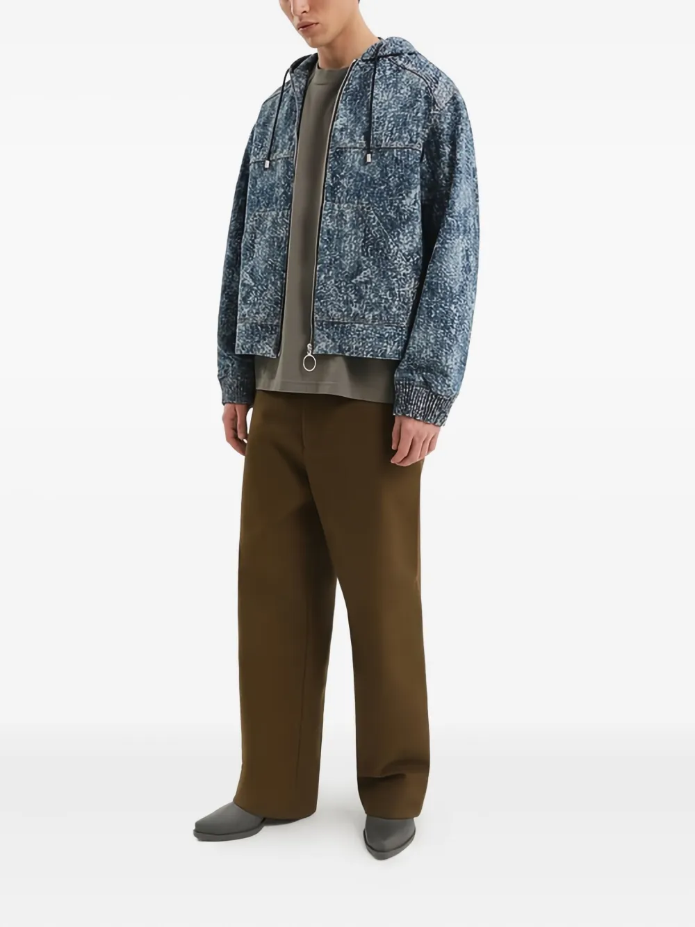 Светло-голубой с узором по всей поверхности, ребристые манжеты, капюшон, застежка-молния спереди, накладные карманы спереди