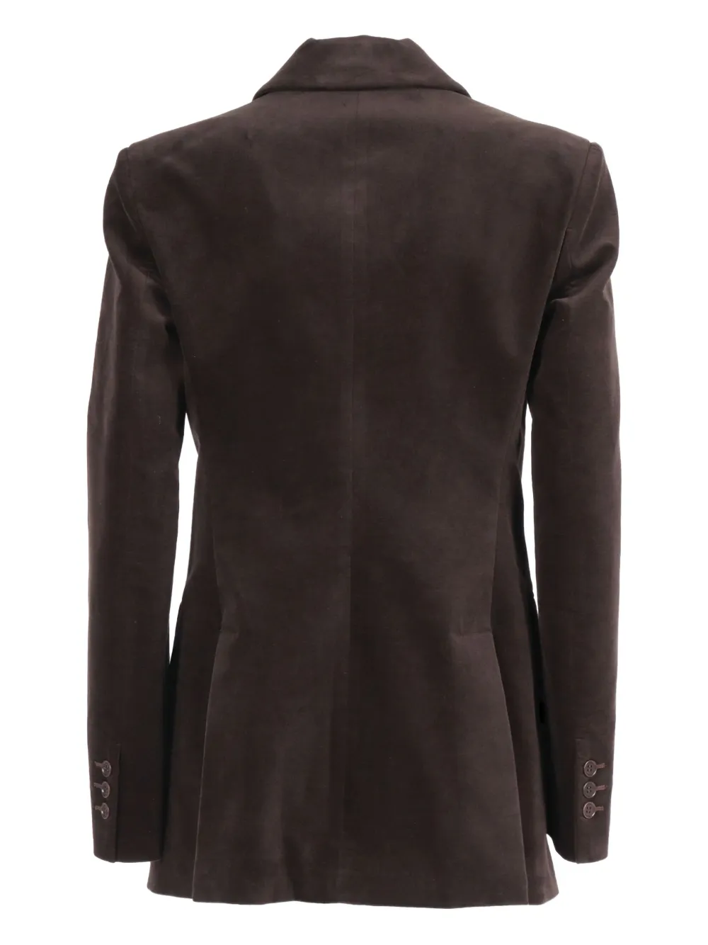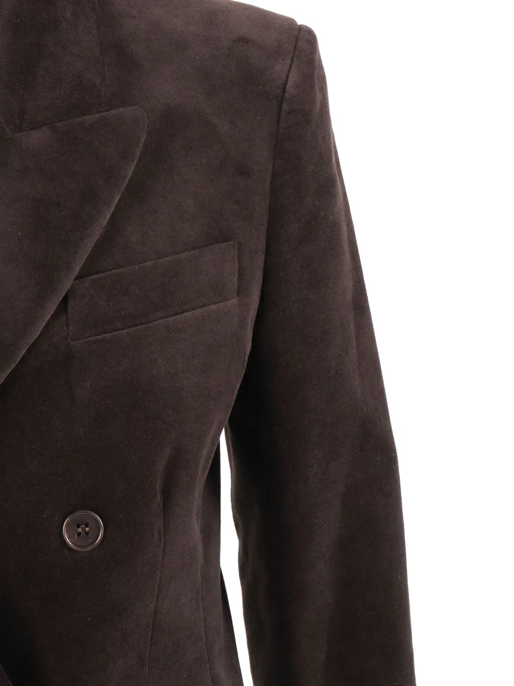 Коричневый двубортный пиджак с застежкой на пуговицы, лацканами с острыми концами, клапанами на карманах и манжетами на пуговицах