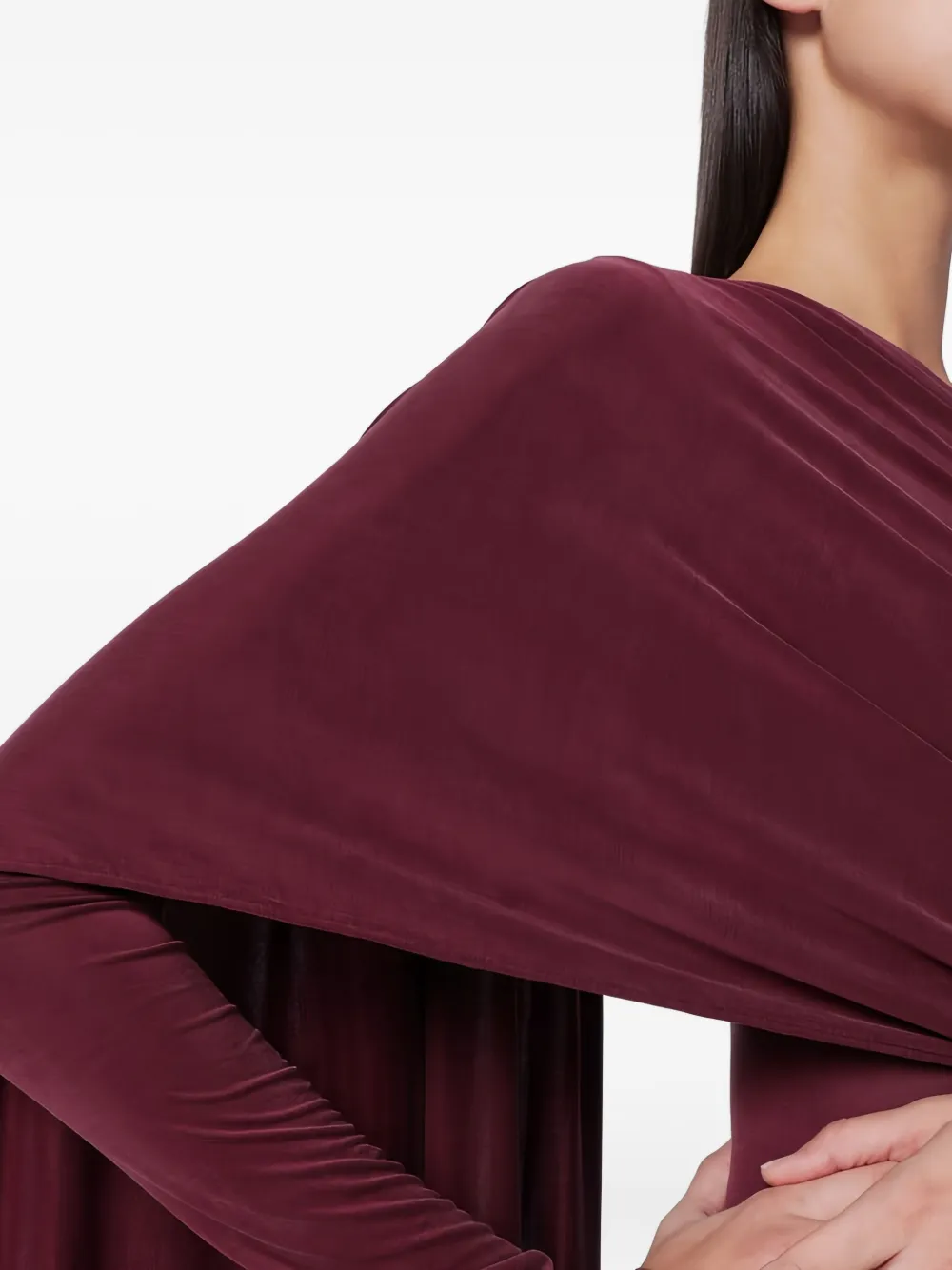 Темно-красное платье с драпировкой и длинными рукавами. Напоминаем, что этот товар необходимо примерять поверх собственной одежды.