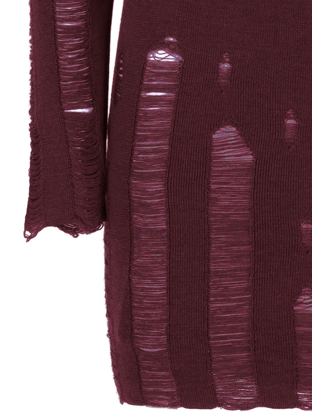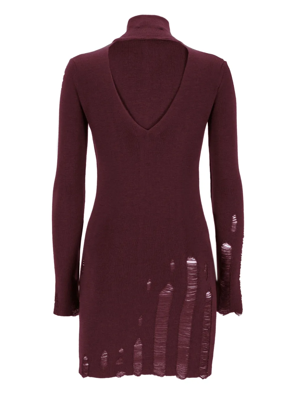 Бордовая водолазка в рубчик с длинными рукавами, потертостями и V-образной спинкой