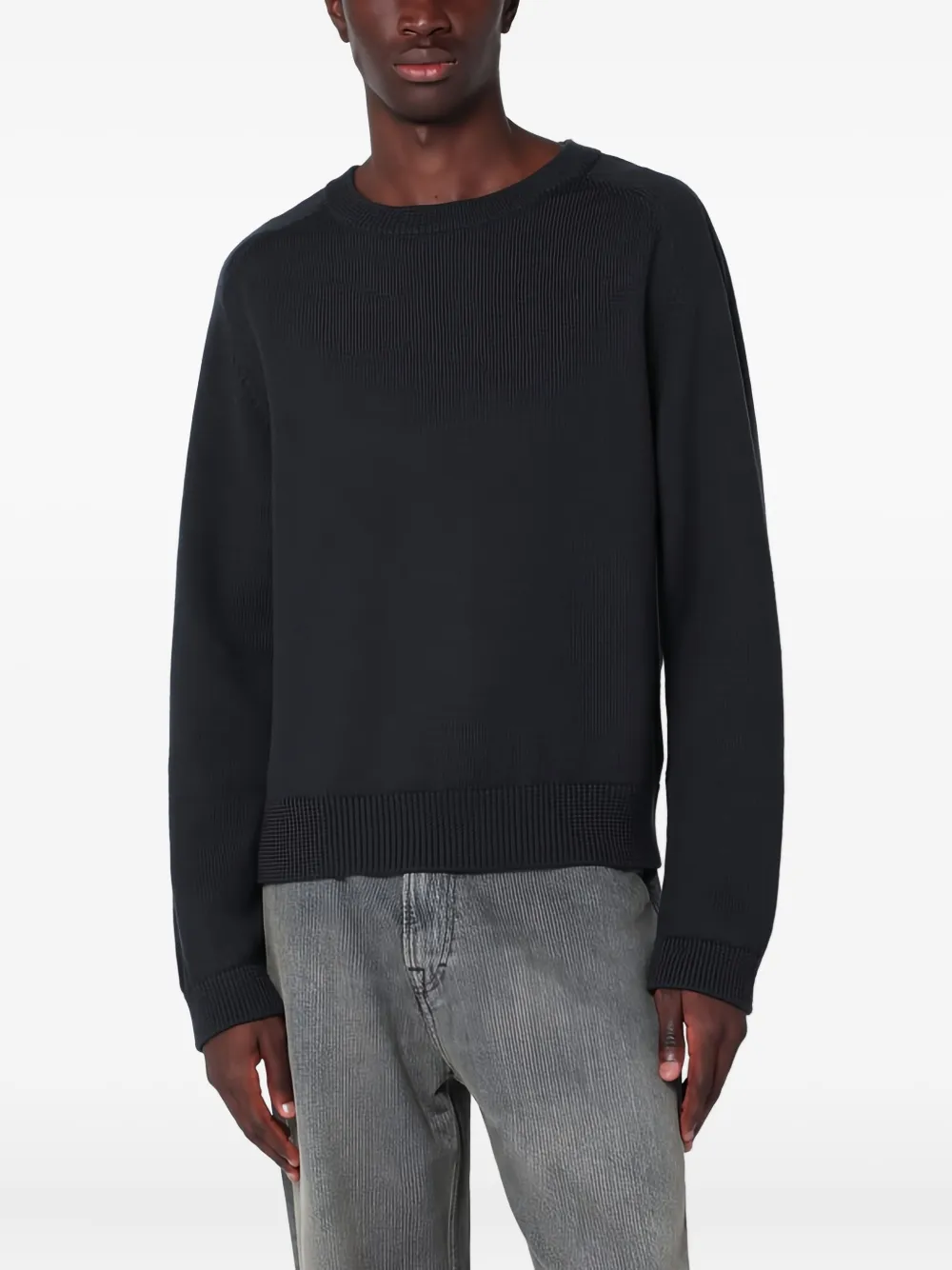Черный свитер с круглым вырезом, длинными рукавами, рубчатой вязкой и прямым подолом