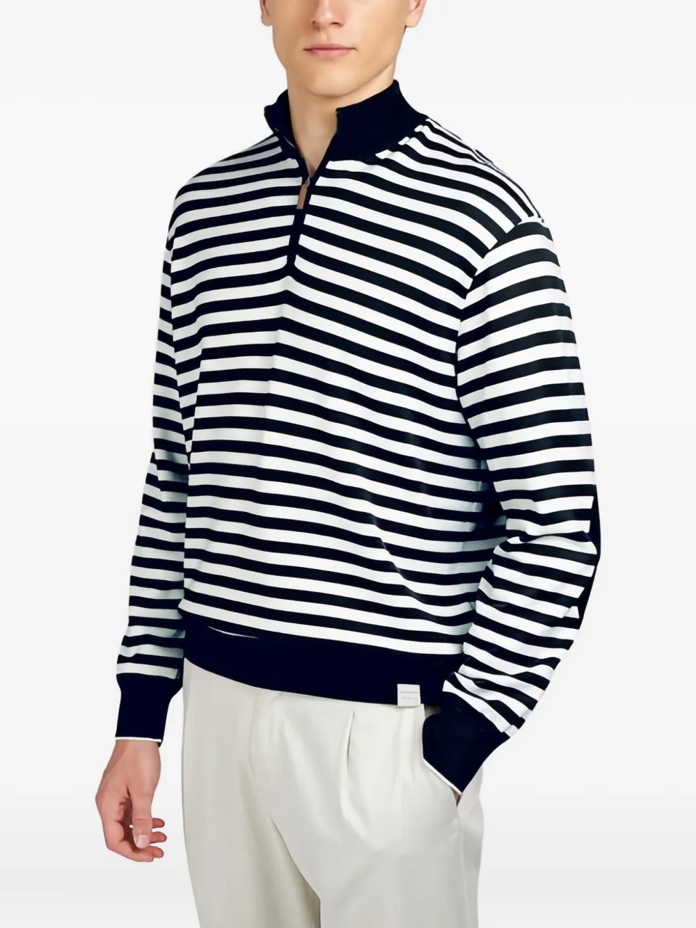 Темно-синий и белый полосатый узор, застежка наполовину на молнии, длинные рукава, ребристые края