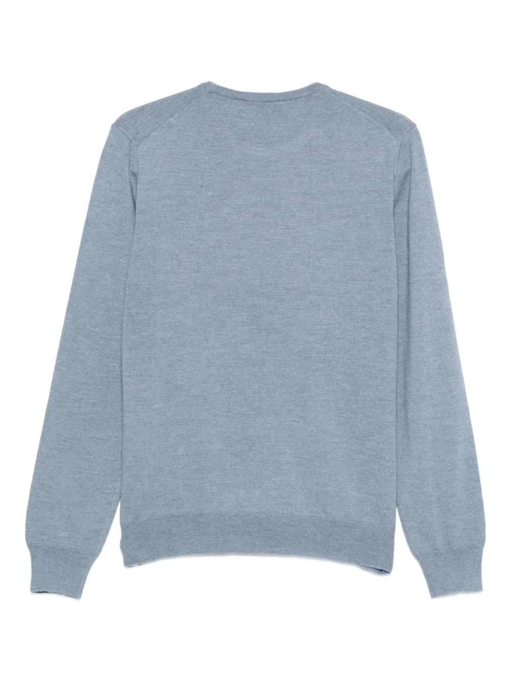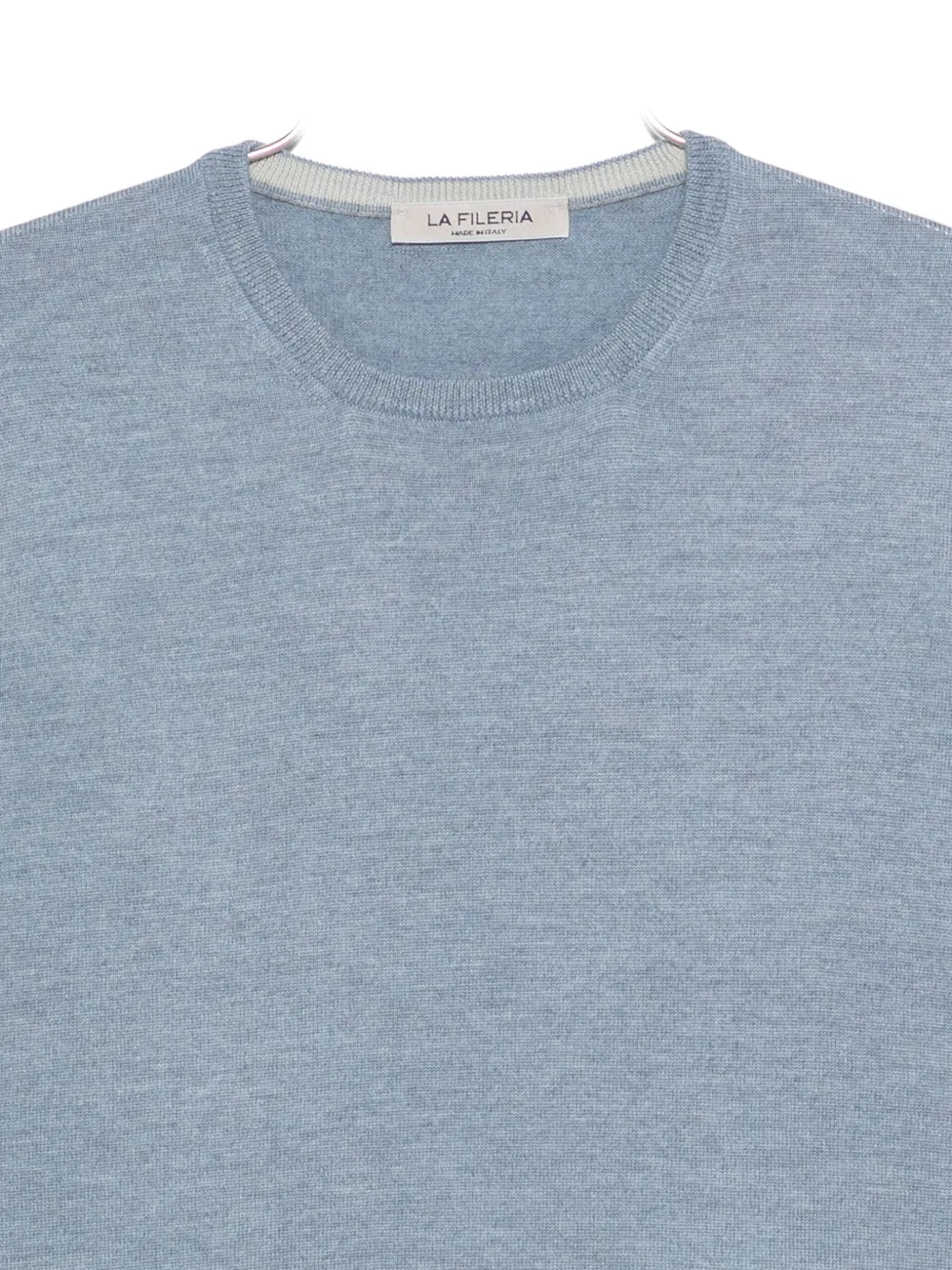 Светло-голубой цвет, круглый вырез, длинные рукава, тонкая вязка, ребристый низ, ребристые манжеты