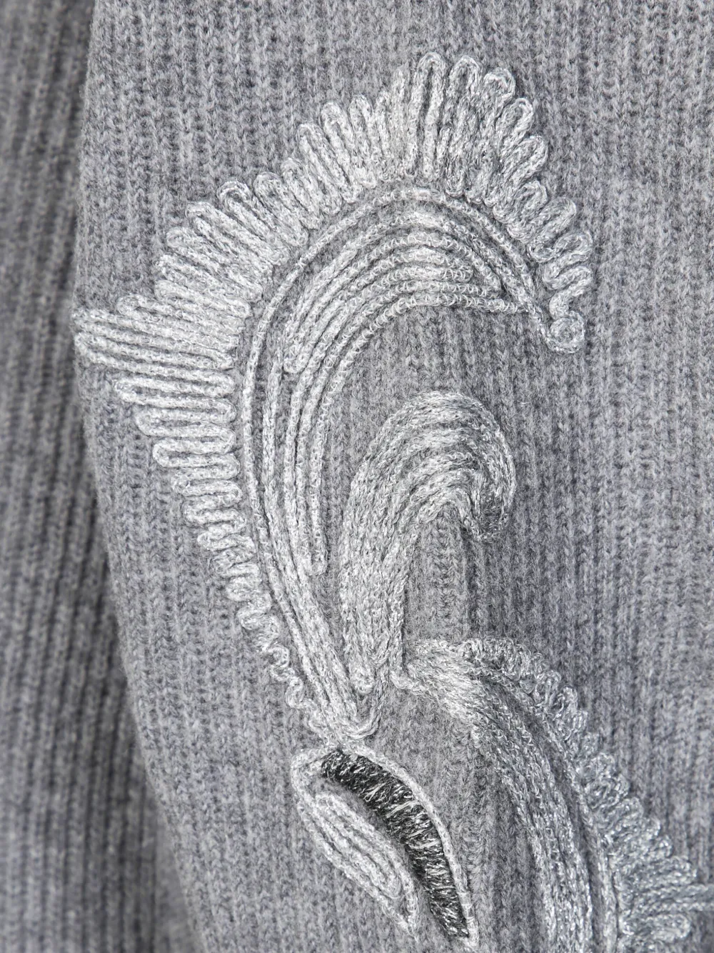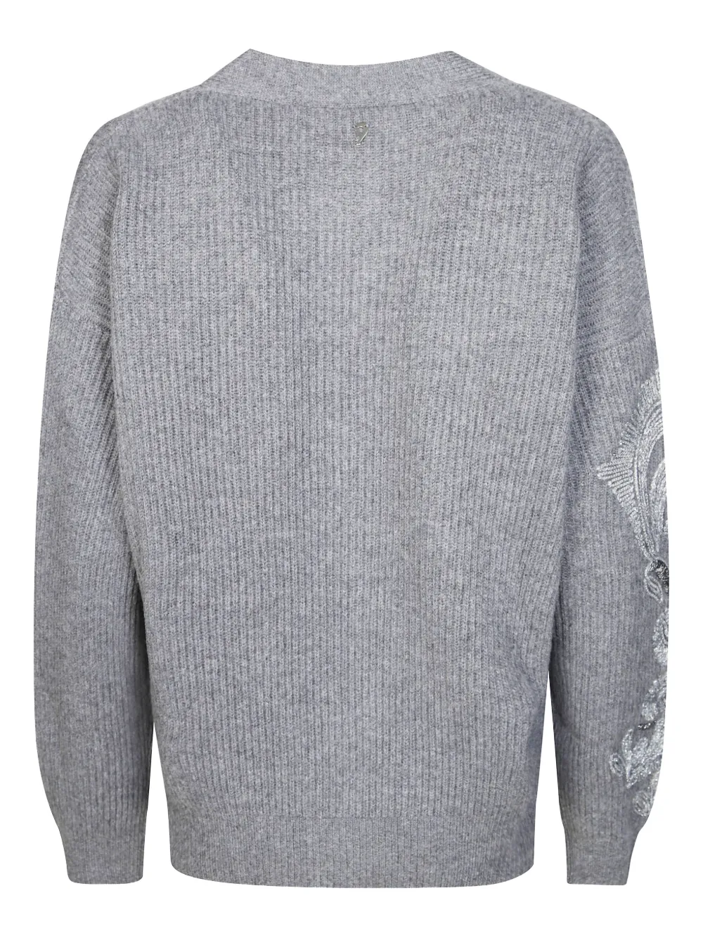 Серый вязаный кардиган с вышивкой, V-образным вырезом, застежкой на пуговицы спереди и длинными рукавами