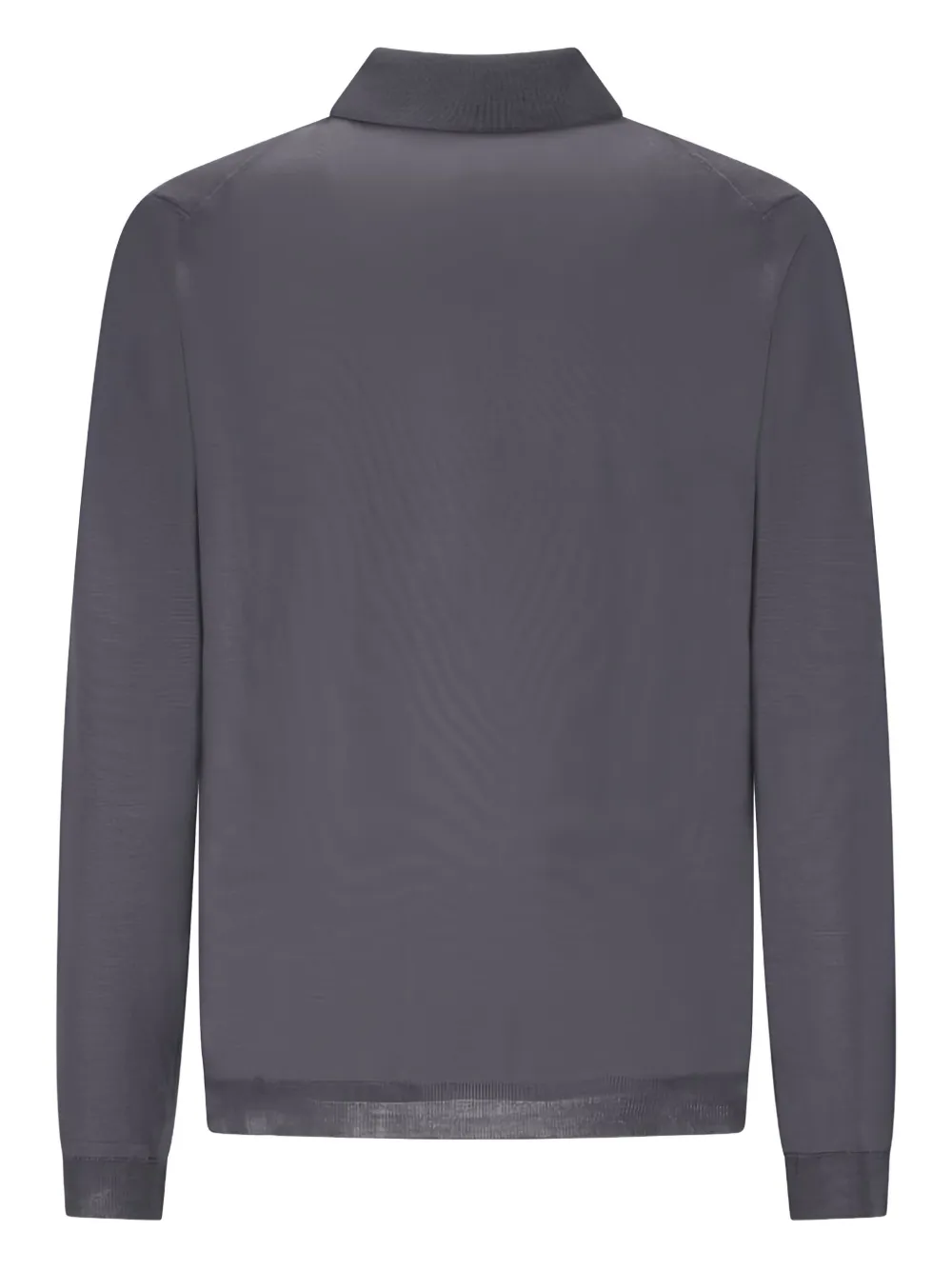 Серый кардиган с застежкой на пуговицы, длинными рукавами, воротником-стойкой, мелкой вязкой и ребристым подолом