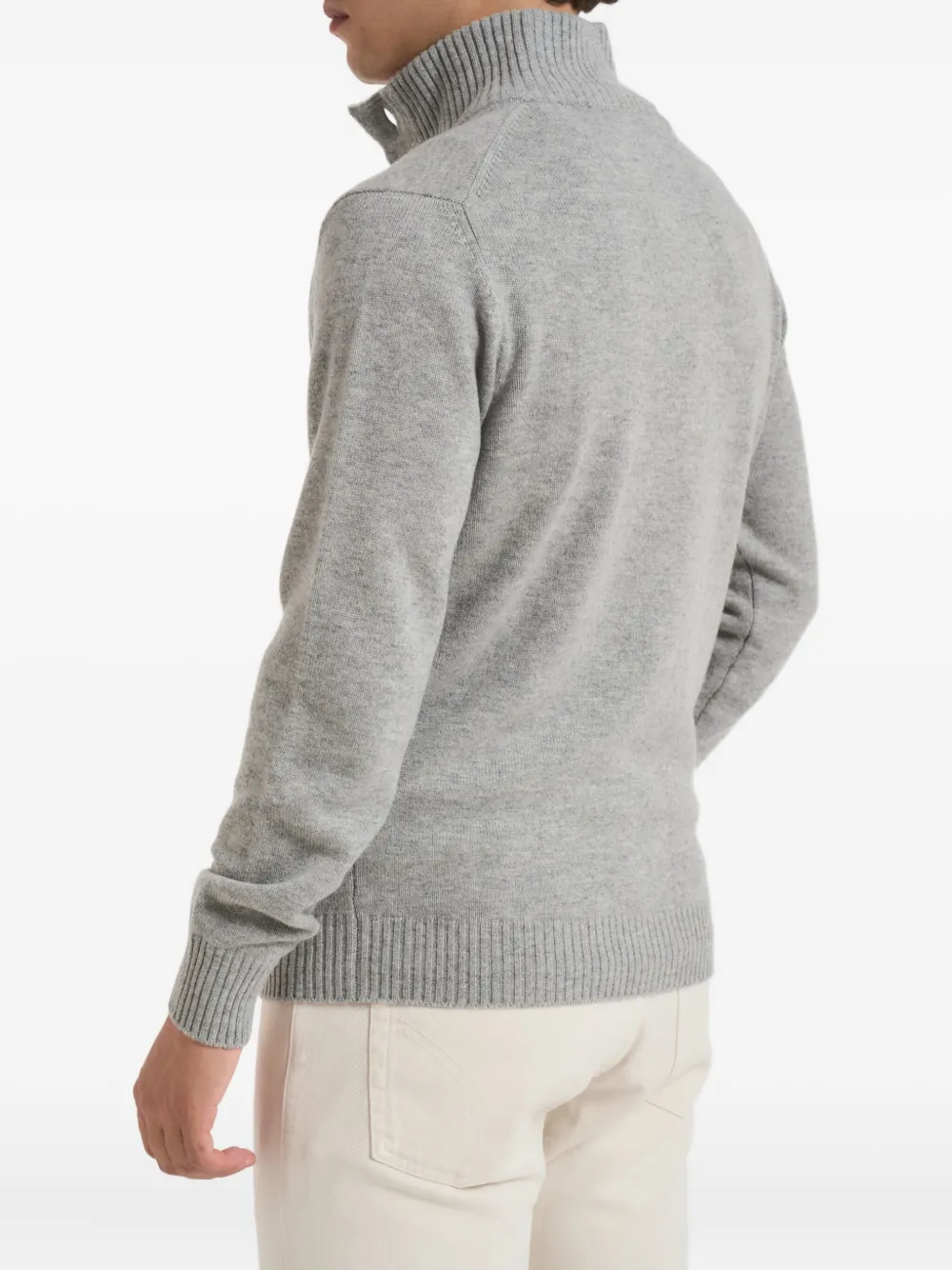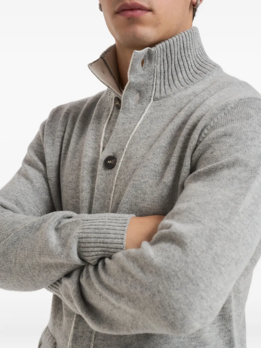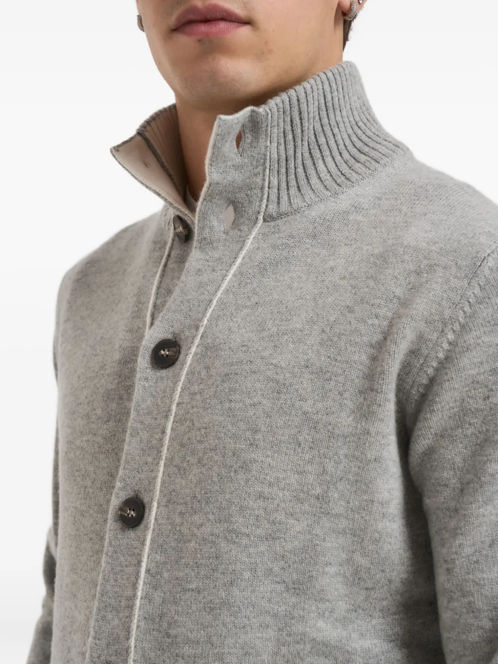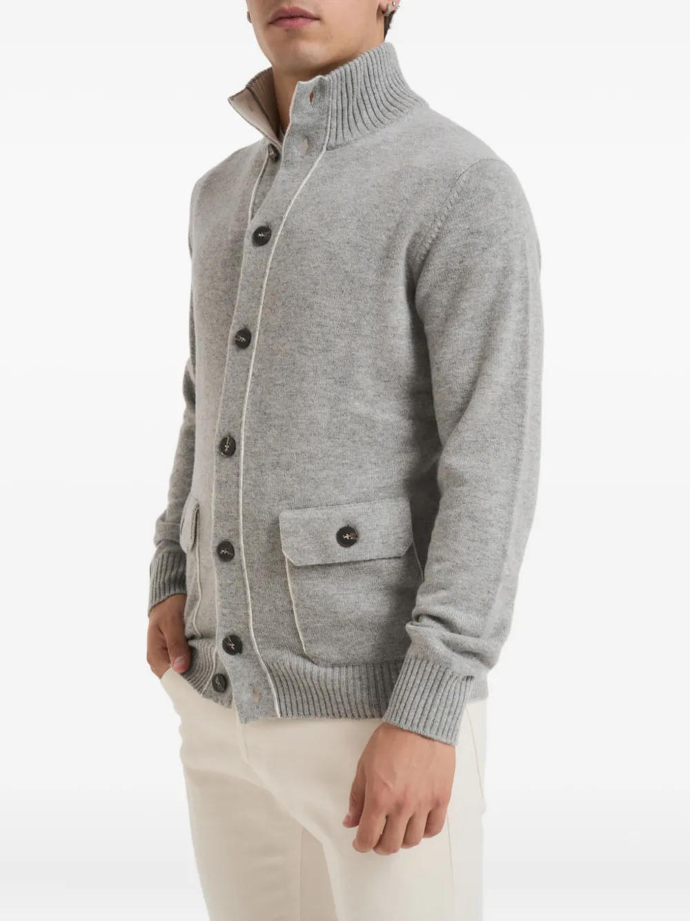 Серый цвет, застежка на пуговицы, высокий воротник, два передних кармана, трикотажная отделка, контрастная окантовка