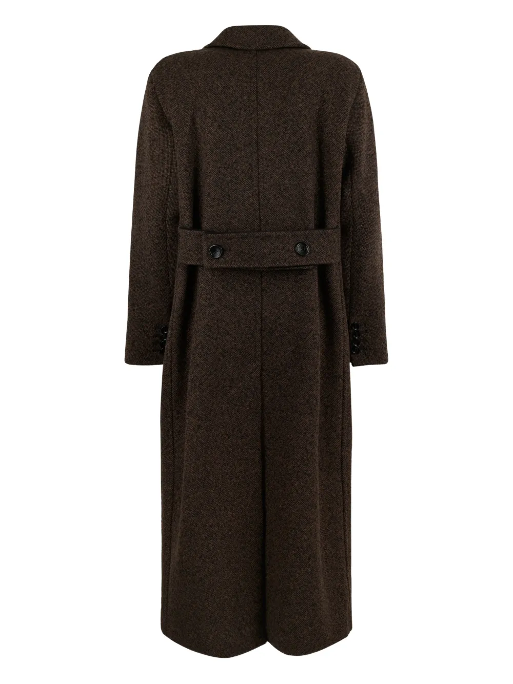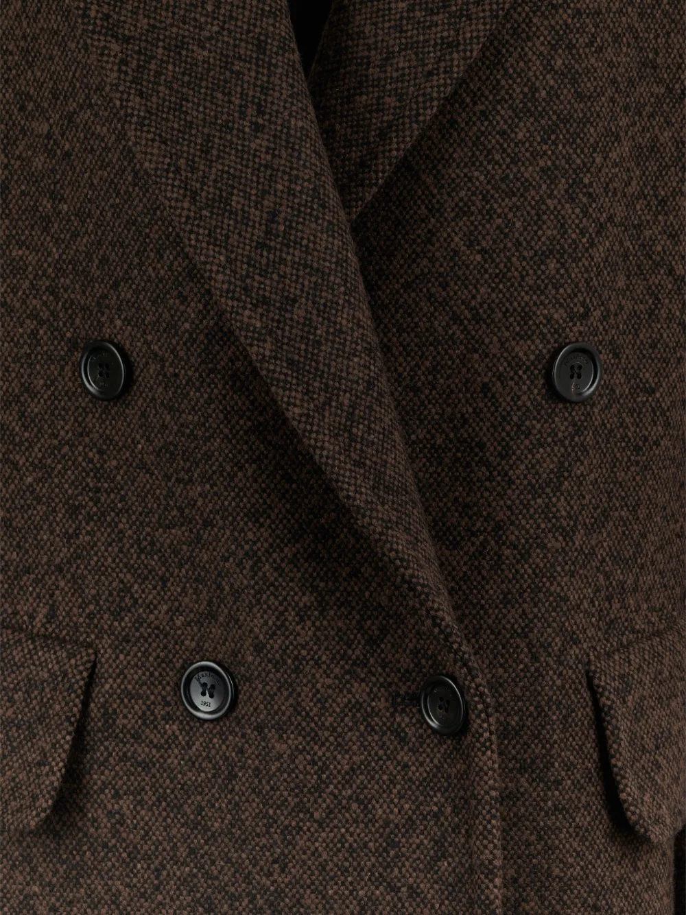 Темно-коричневый двубортный пиджак, застежка на пуговицы, лацканы с вырезом, клапанные карманы, пуговичная планка сзади