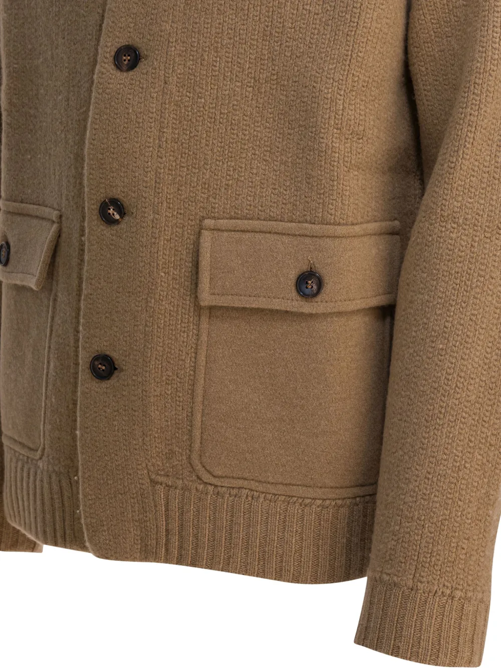 Коричневая куртка из шерсти с кашемиром, застежка на пуговицы, круглый вырез, передние клапанные карманы, ребристый низ