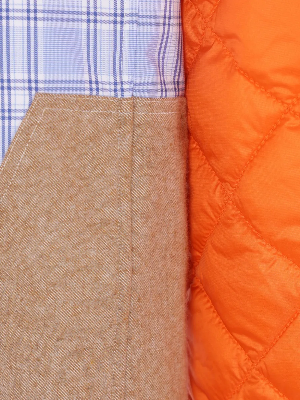 Вставки из фланели с фиолетово-оранжевым клетчатым узором, стеганая панель на спине, воротник на пуговицах, нагрудный накладной карман