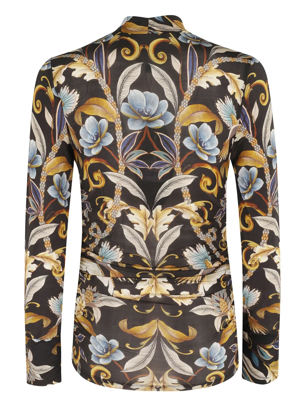 Черная блузка с цветочным принтом, длинными рукавами и высоким воротником