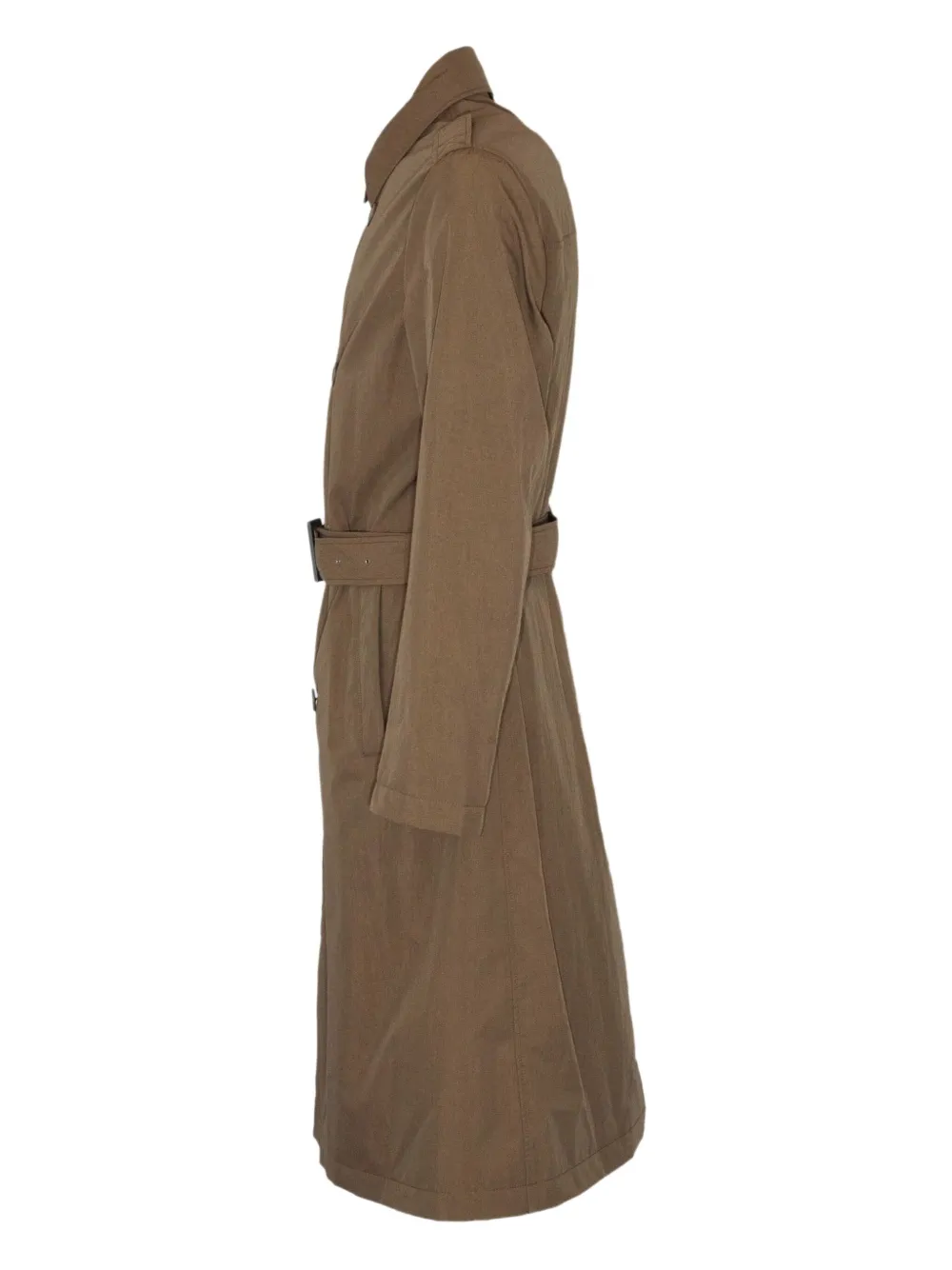 Зеленое двубортное пальто с застежкой на пуговицы, ремнем с пряжкой и длинными рукавами