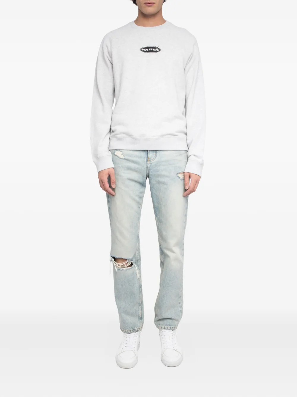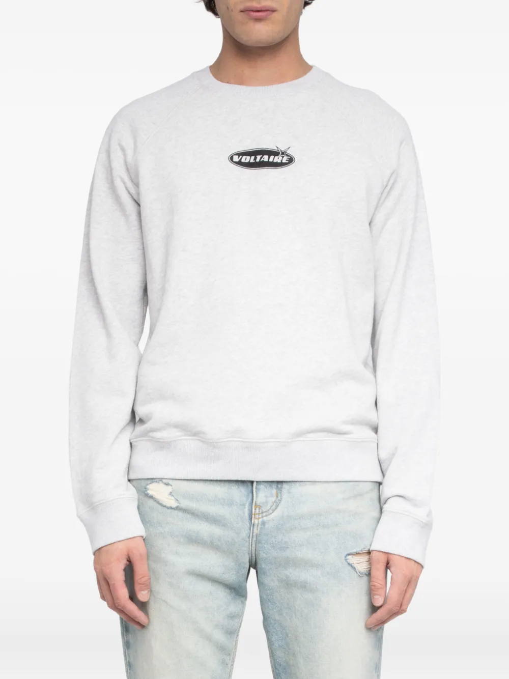 Светло-серый джемпер с логотипом, круглым вырезом, длинными рукавами и ребристыми манжетами