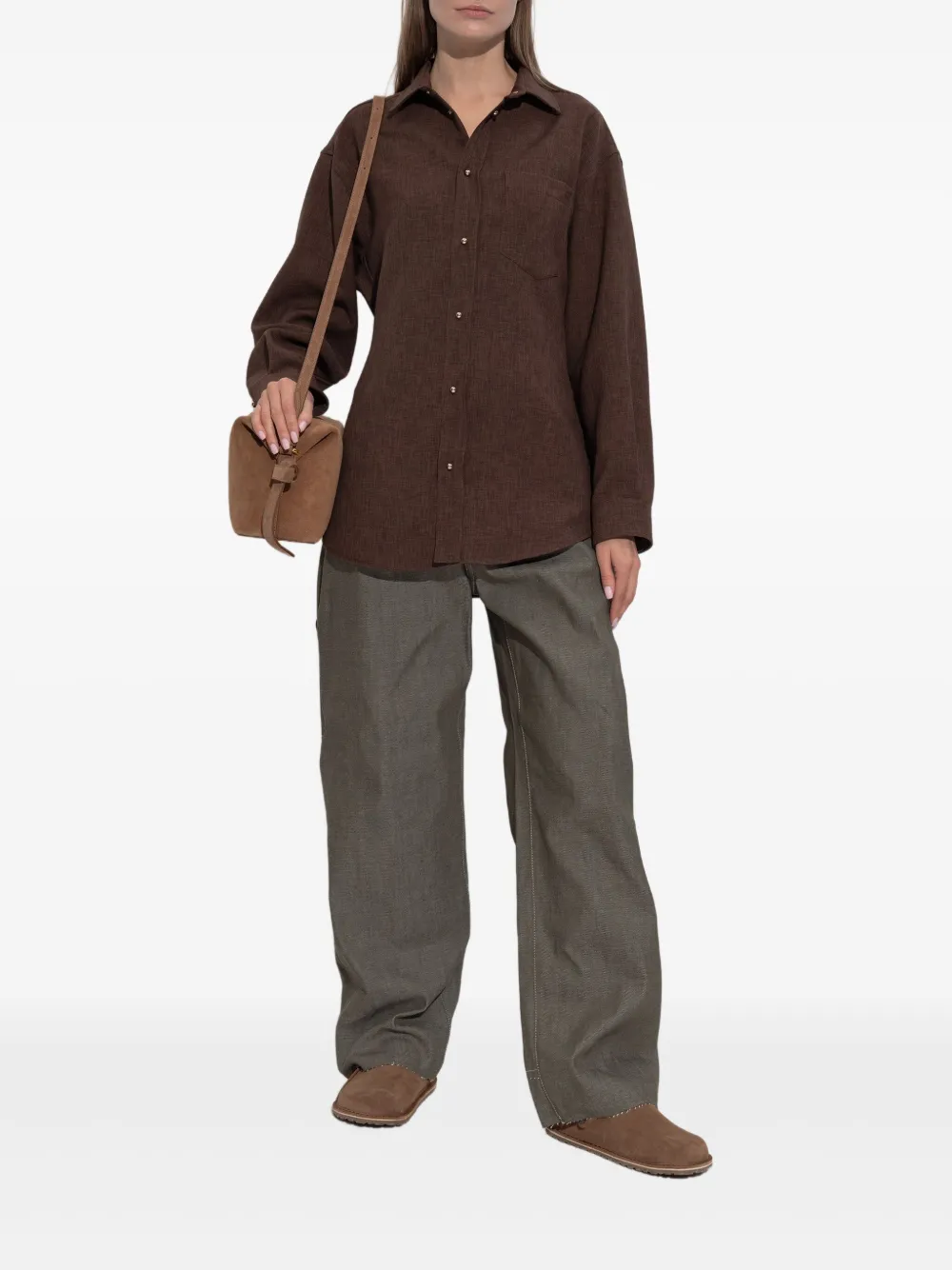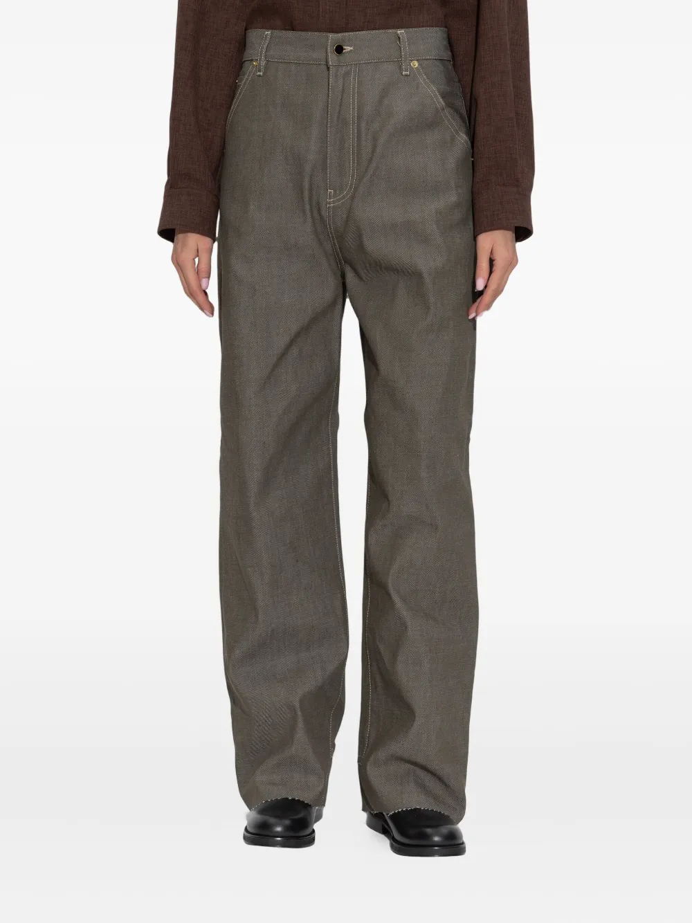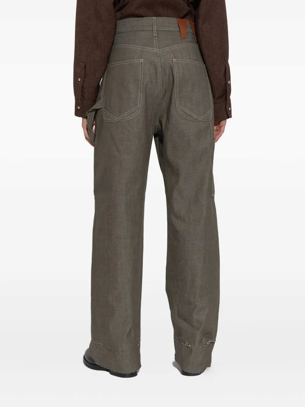 Хаки, контрастная строчка, шлевки для ремня, пять карманов, петля для инструментов, необработанный край