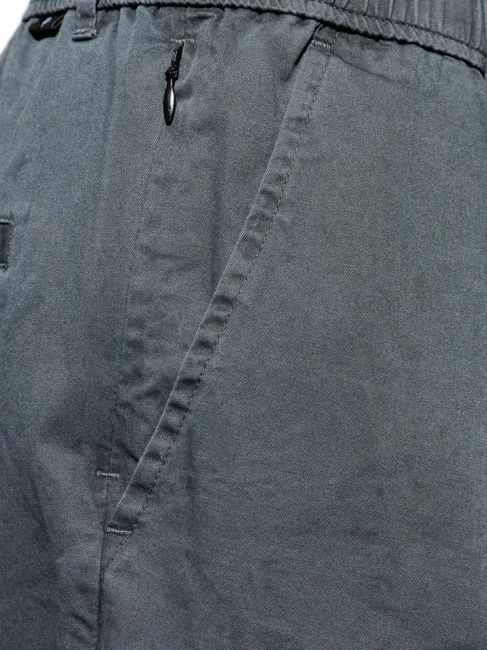Серый цвет, эластичный пояс, застежка на пуговицу спереди, боковые карманы с косым входом, задний прорезной карман