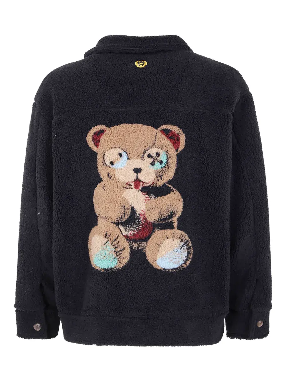 Черная куртка из материала под мишку, застежка на пуговицы, нагрудные карманы, отложной воротник, графичный принт на спине