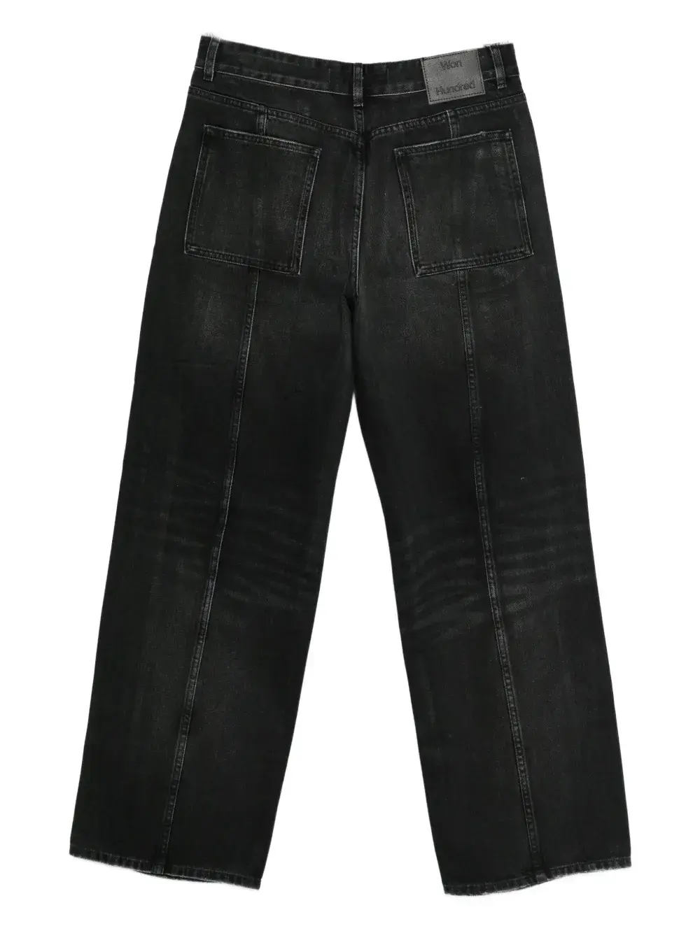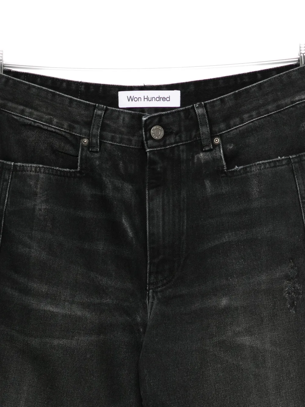 Потертый черный цвет, застежка на пуговицу и молнию, шлевки для ремня, накладные карманы сзади, задний нашивка с логотипом