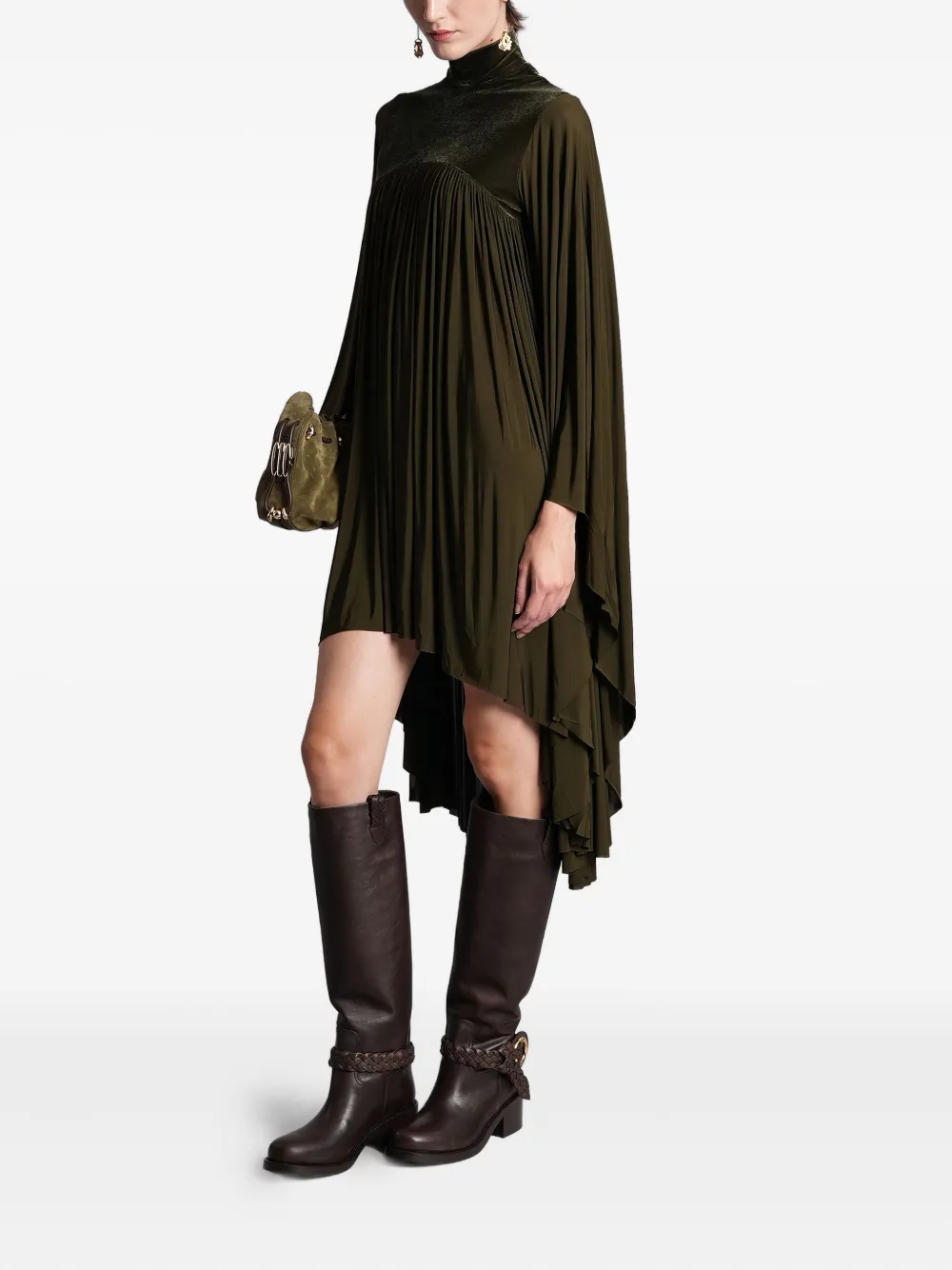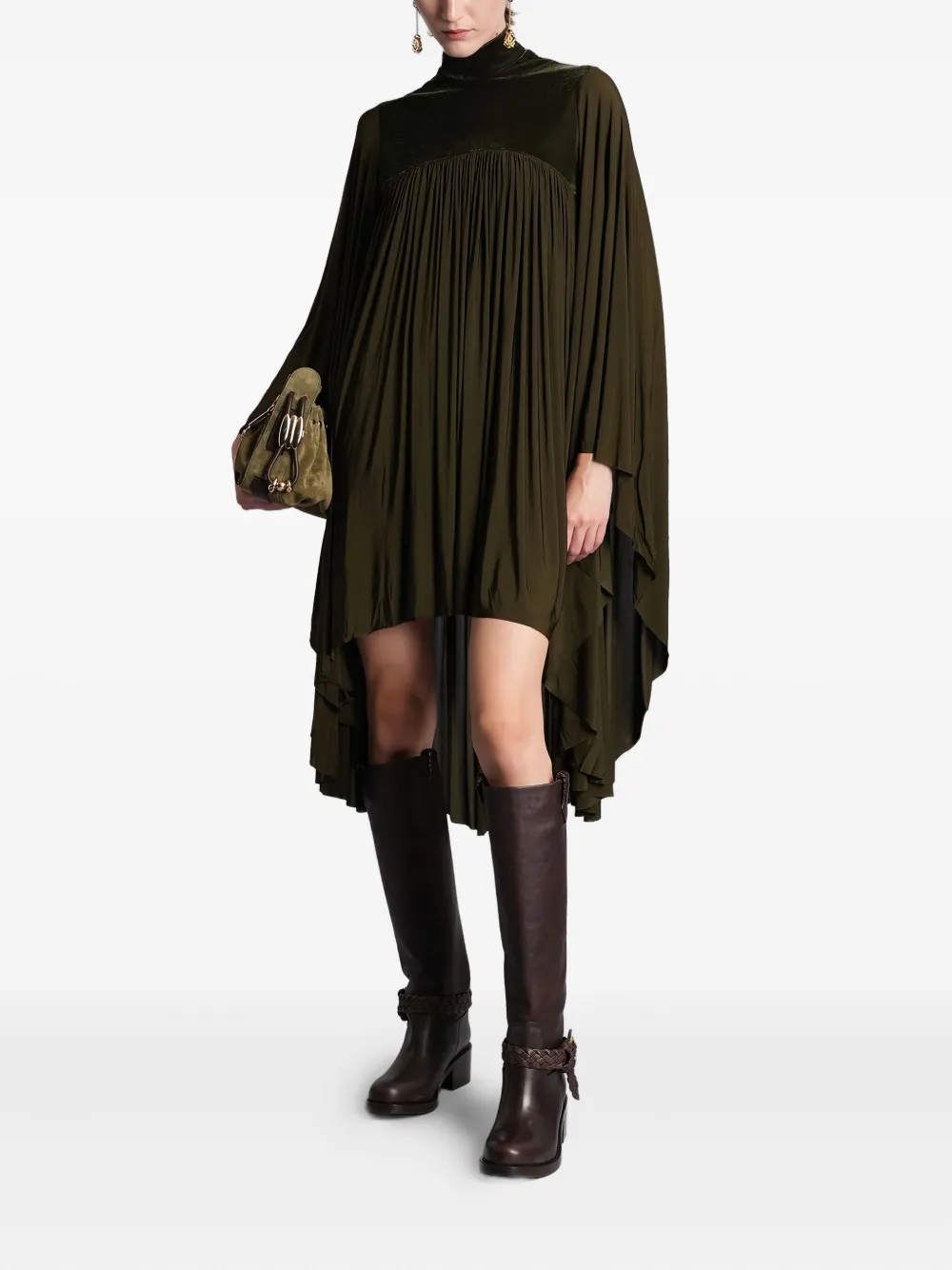 Зеленый топ с высоким воротом, плиссированной отделкой, рукавами летучая мышь, асимметричным подолом и бархатными вставками
