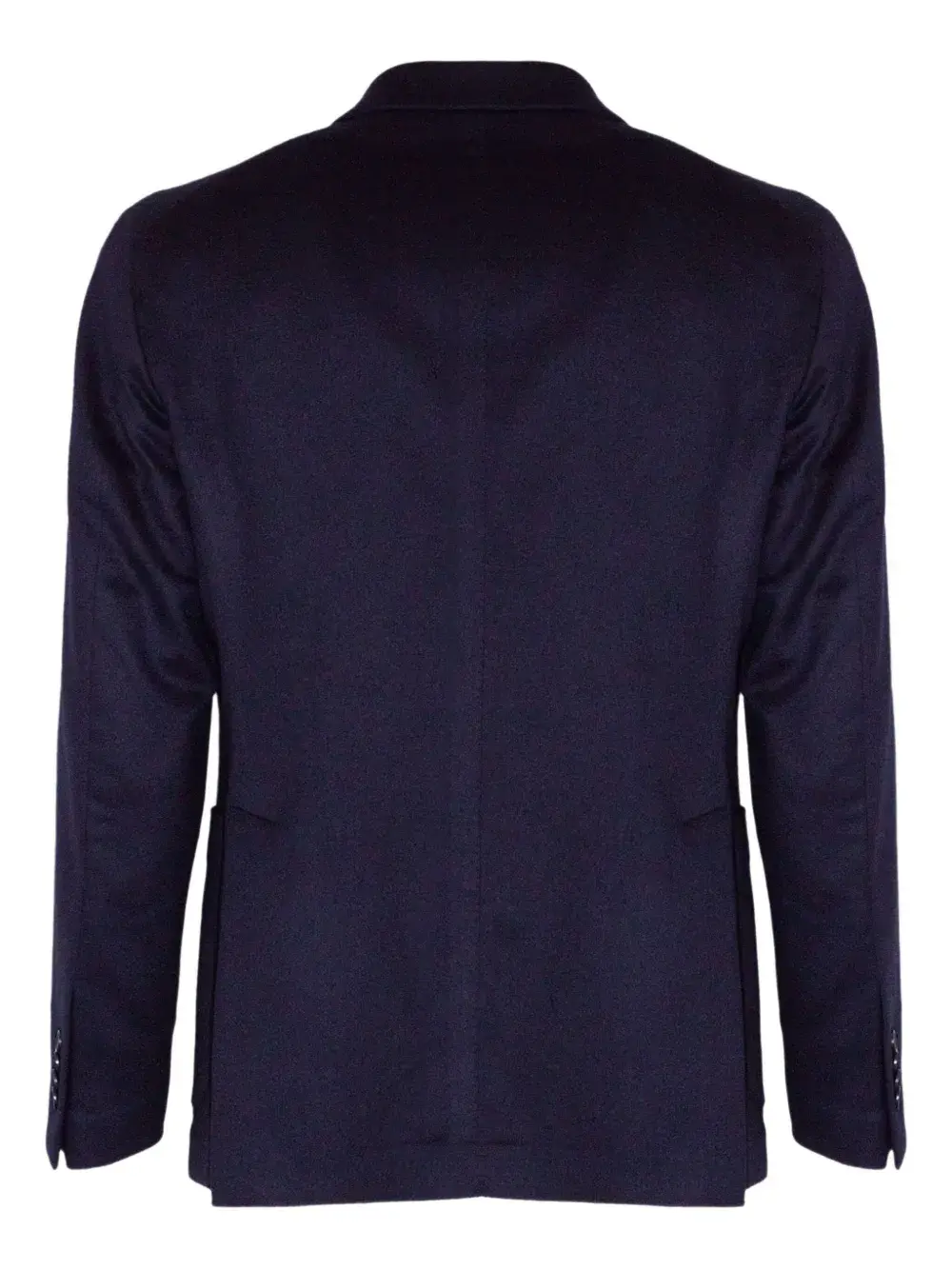 Синий двубортный пиджак с застежкой на пуговицы, лацканами с острыми концами, нагрудным прорезным карманом и передними клапанами