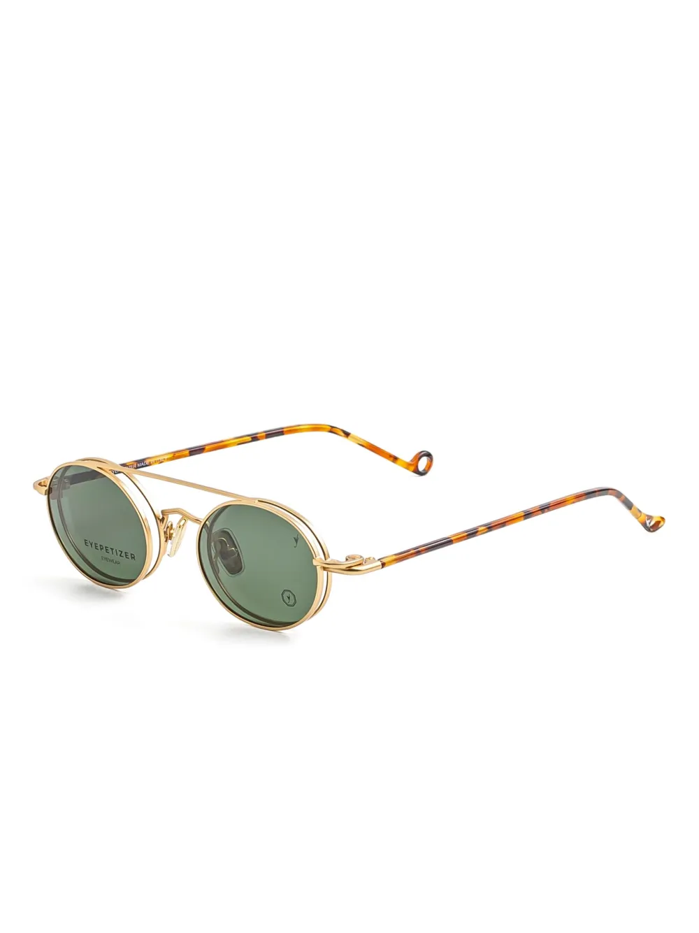 Золотая круглая оправа, эффект "черепахового панциря" на носоупорах, съемные линзы, тонированные линзы. Эти очки поставляются с защитным футляром.