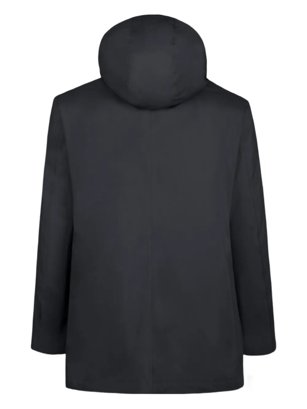 Черный капюшон, застежка на кнопках спереди, длинные рукава, карманы, карман на молнии