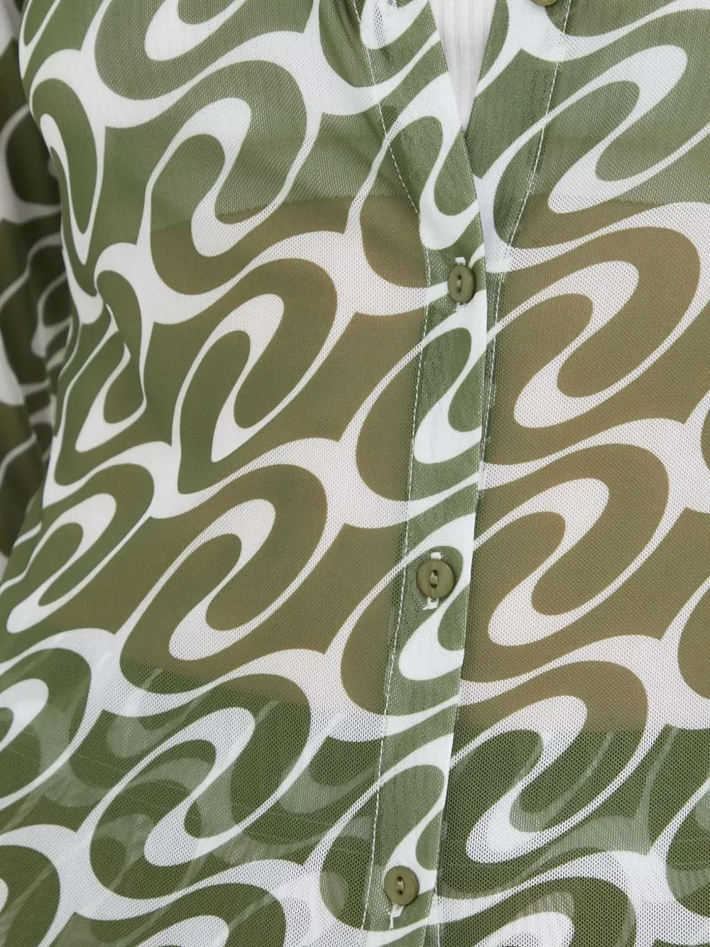 Зеленая рубашка с узором, застежкой на пуговицы, длинными рукавами и классическим воротником