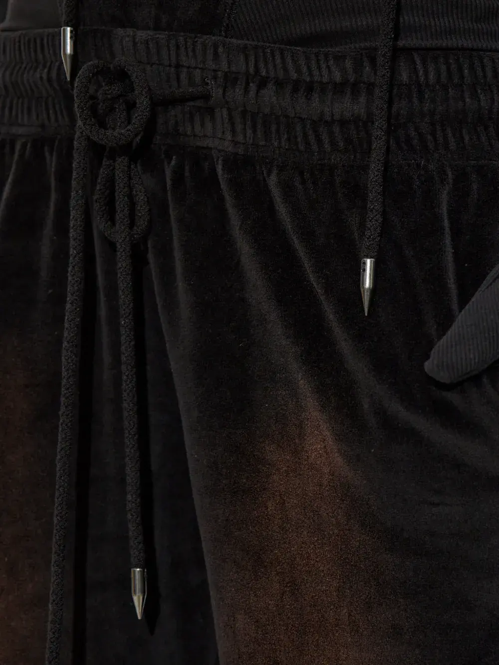 Черный цвет, завязка на шнурке, эластичный пояс, бархатистый эффект, логотип, боковые карманы