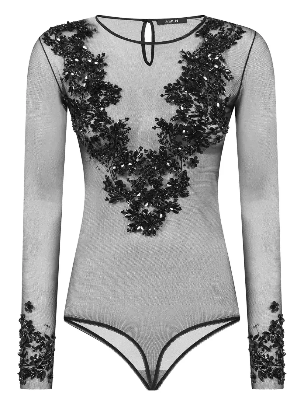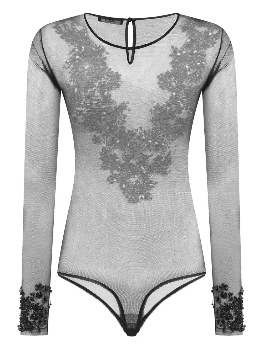 Черные декоративные элементы, длинные рукава, вырез-капля на шее, цветочный принт, прозрачная ткань