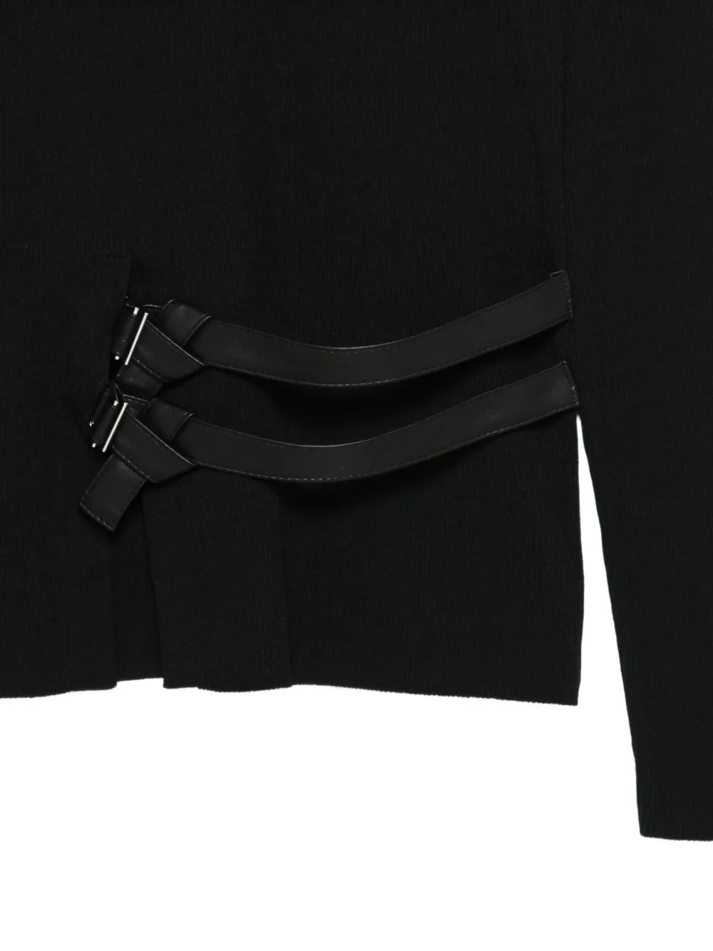 Черный вязаный пуловер в рубчик с круглым вырезом, длинными рукавами и ремешками с пряжками по бокам